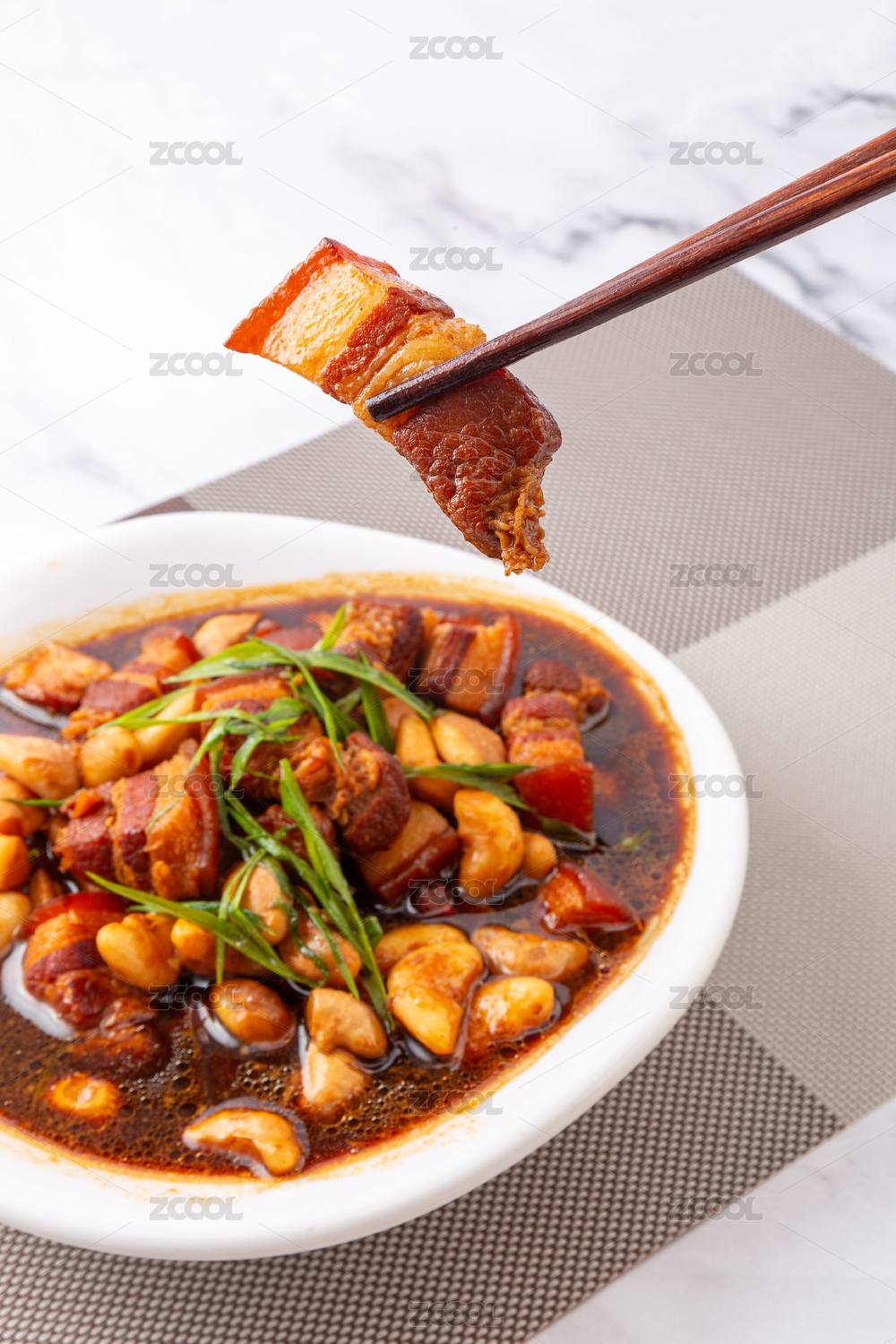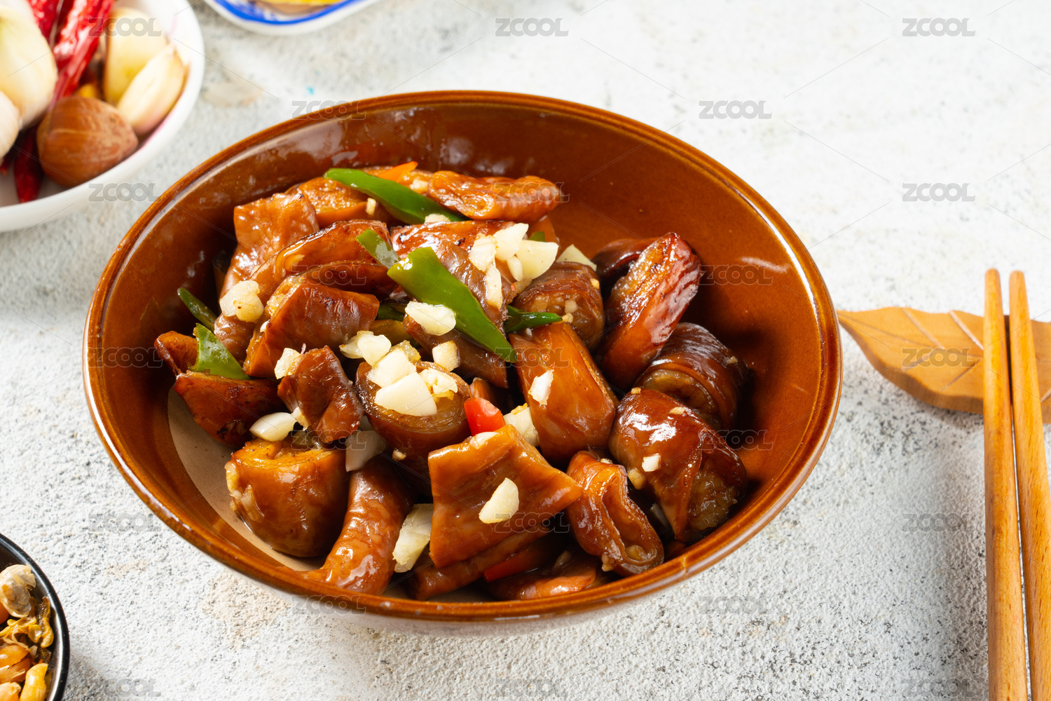 白色盘子里筷子夹着的红烧肥肠猪大肠