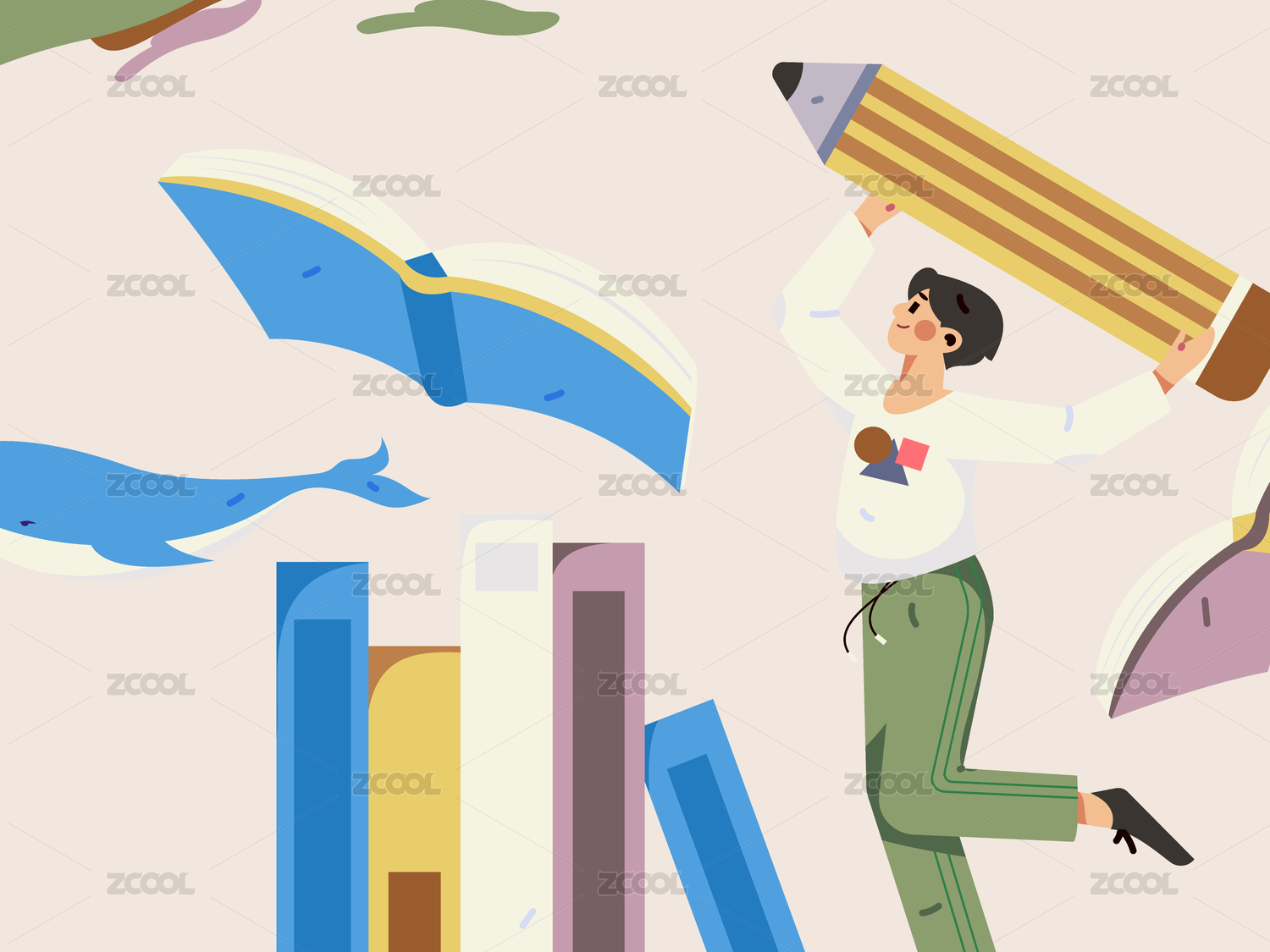 一个卡通男生周边布满书本