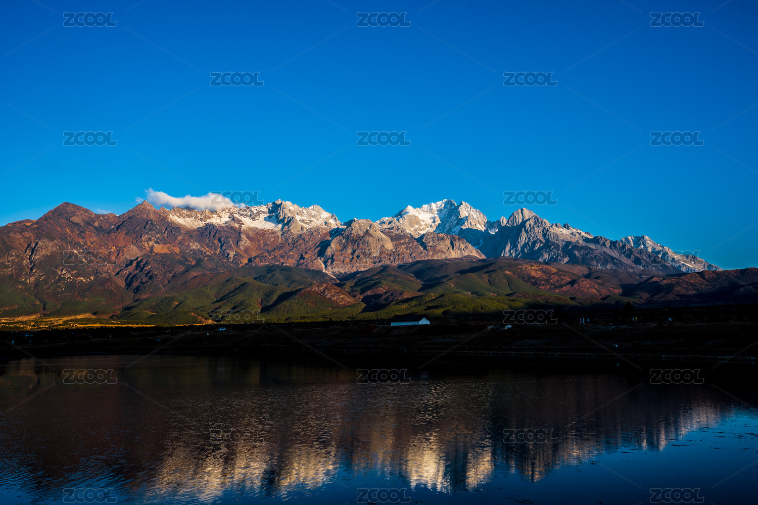 清晨湖水倒影玉龙雪山日照金山