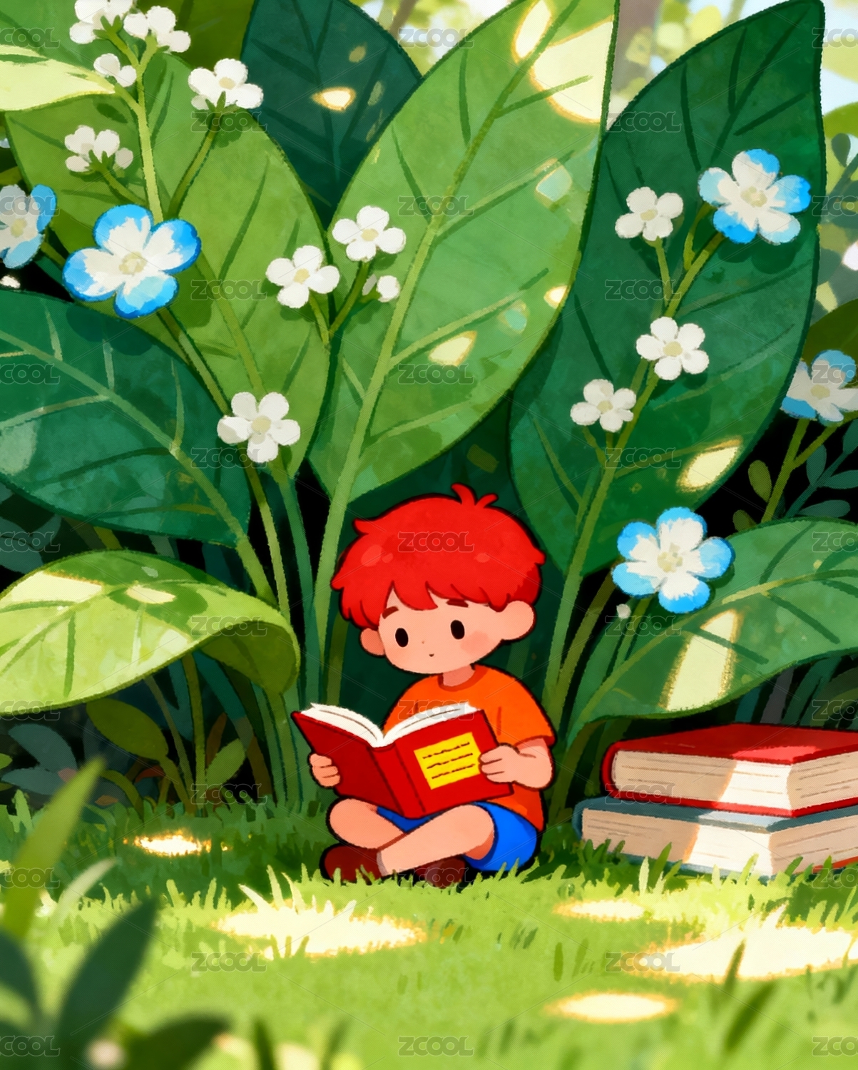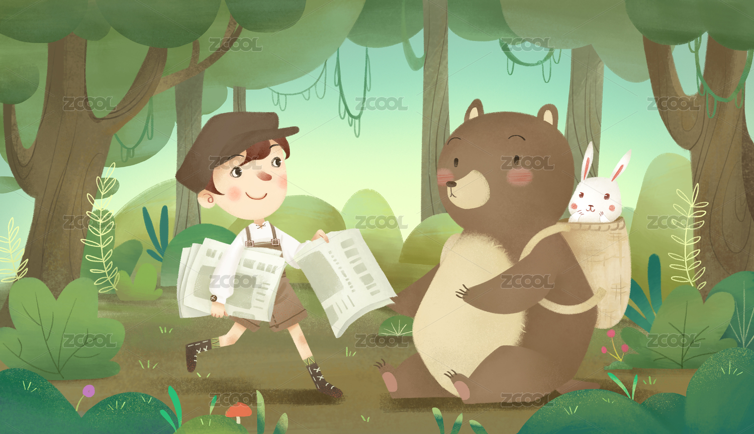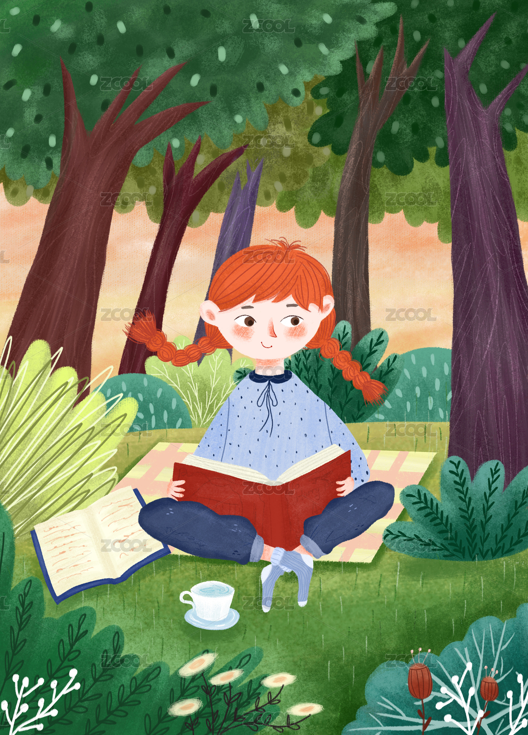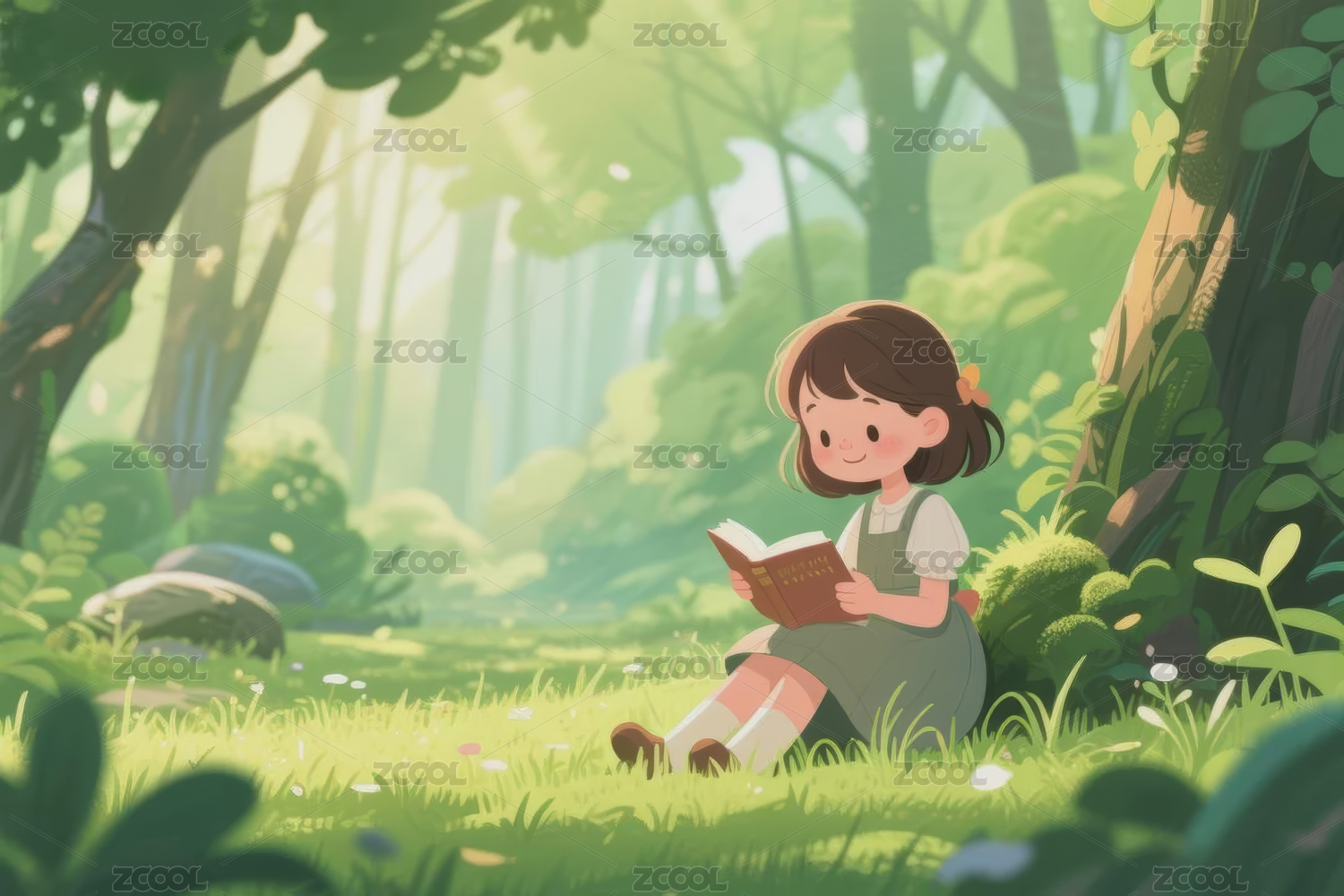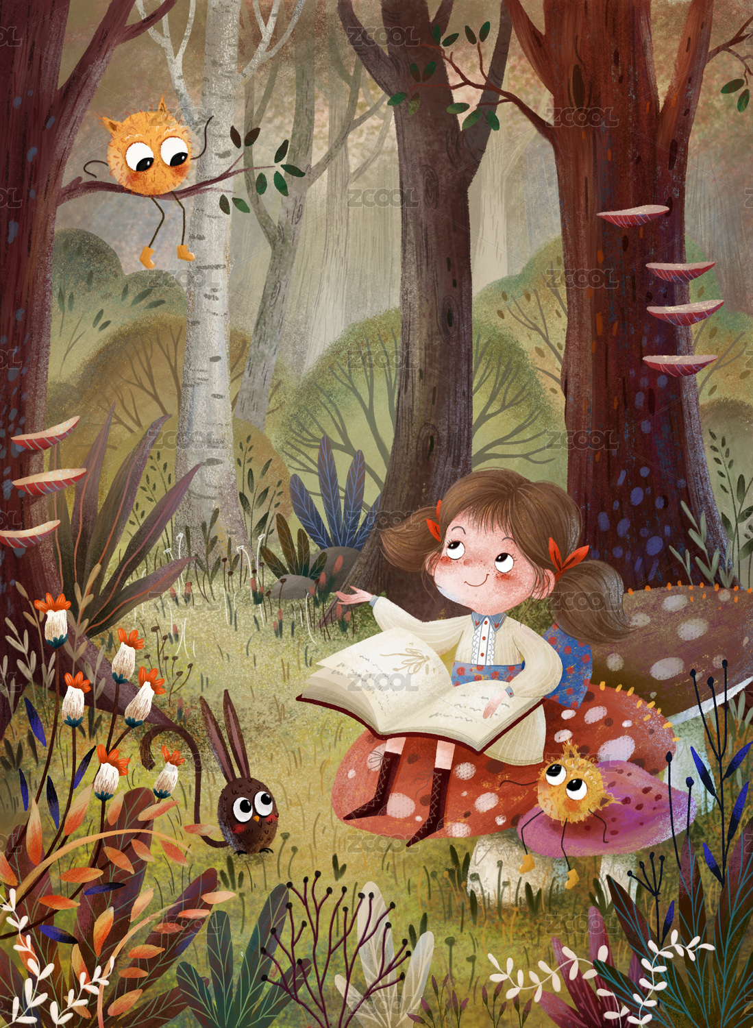 森林,女孩,看书,熊,治愈,自然,鸟,梦幻