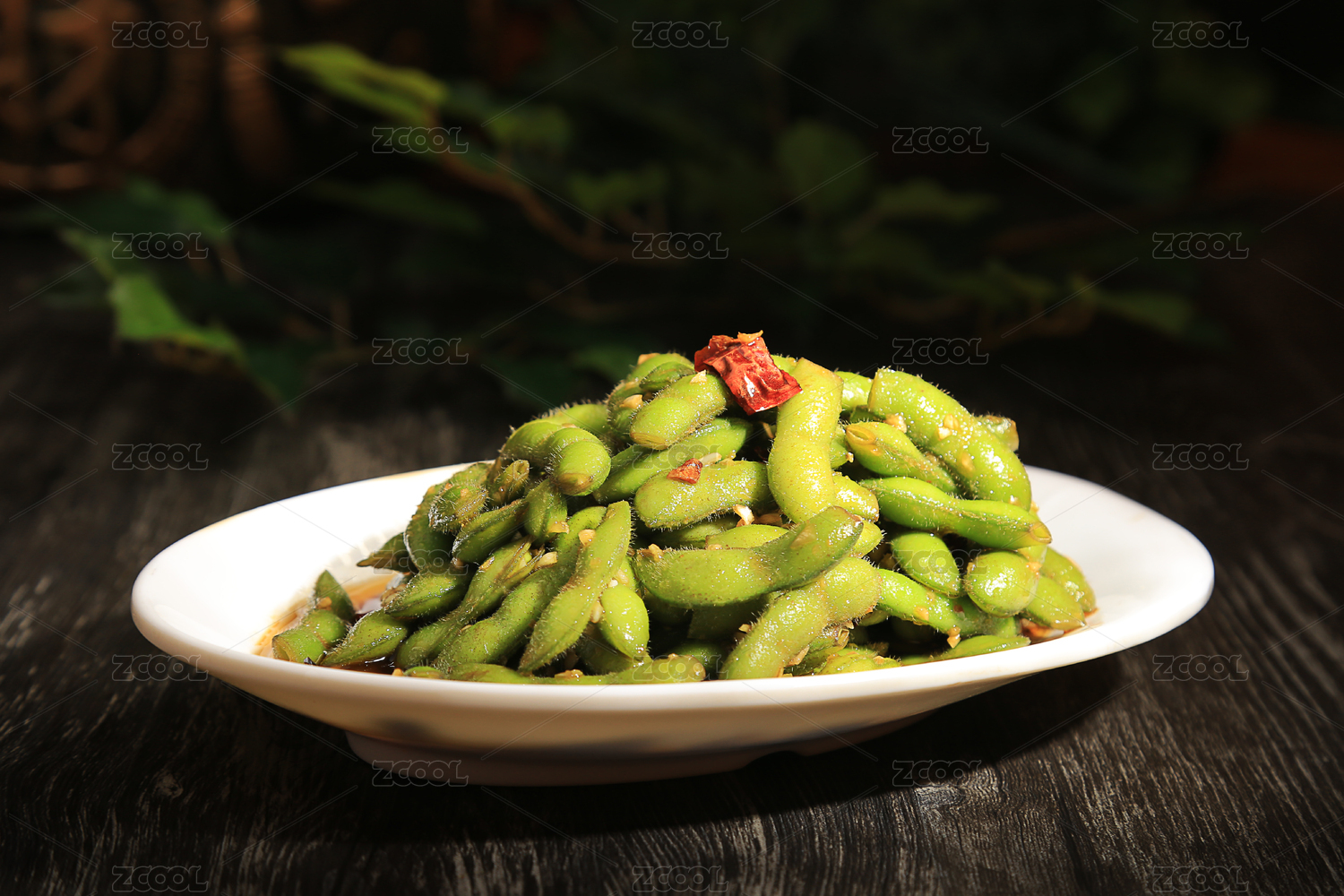 深色木板上一个白色瓷盘里的凉拌毛豆