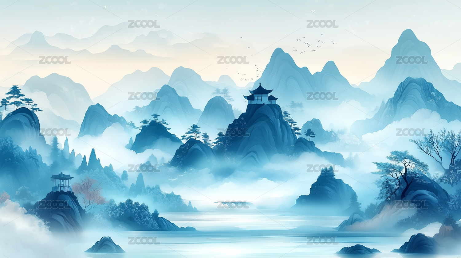 中国传统浅蓝色山水古风国风水墨画背景壁纸