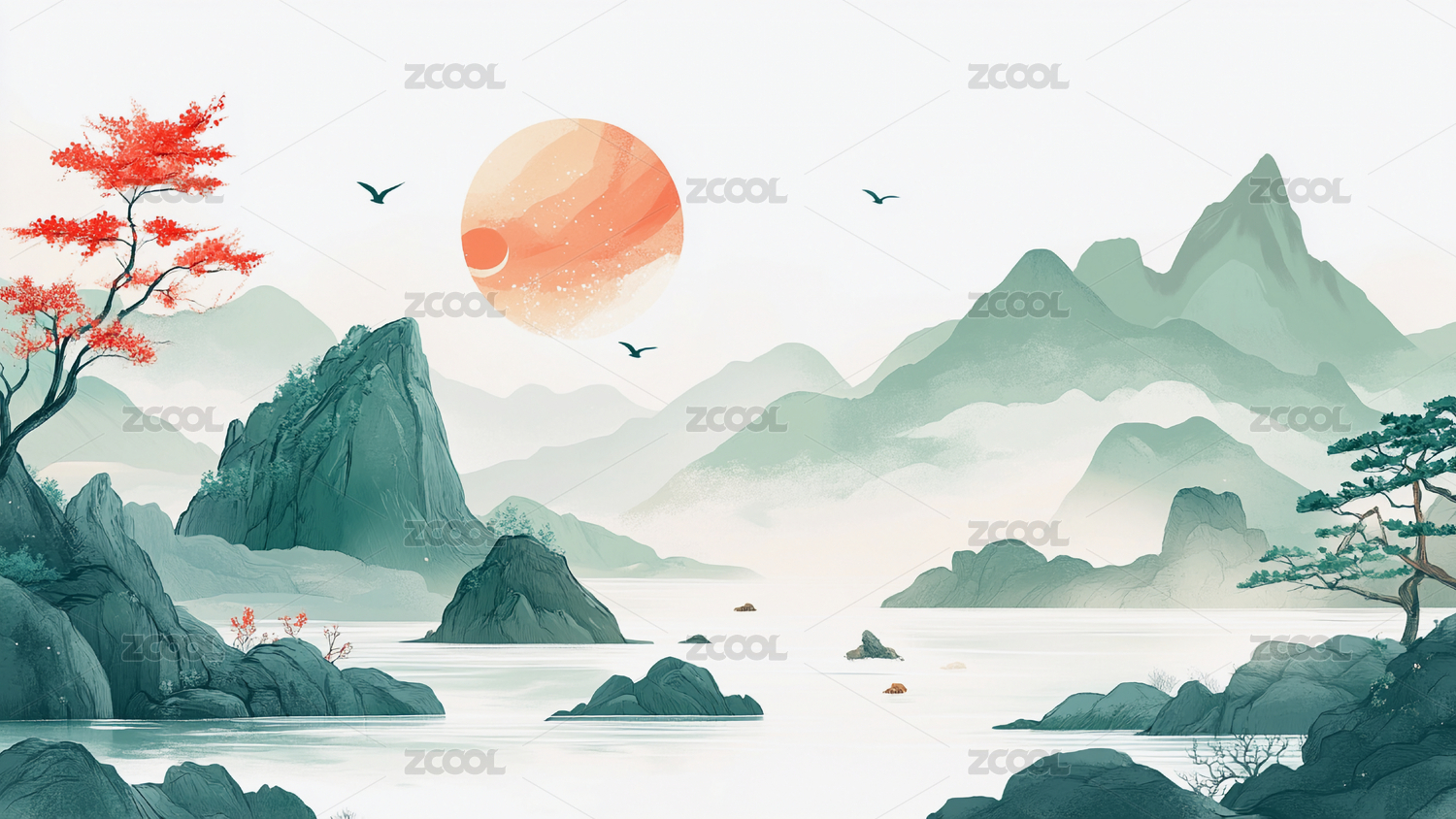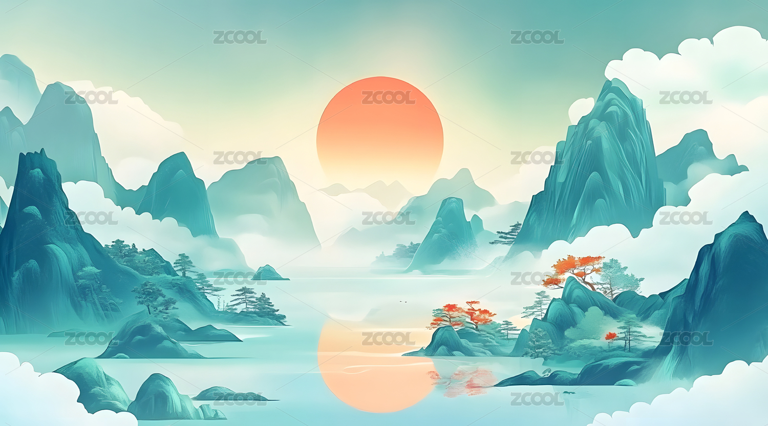 青绿山水传统古风国潮背景图壁纸
