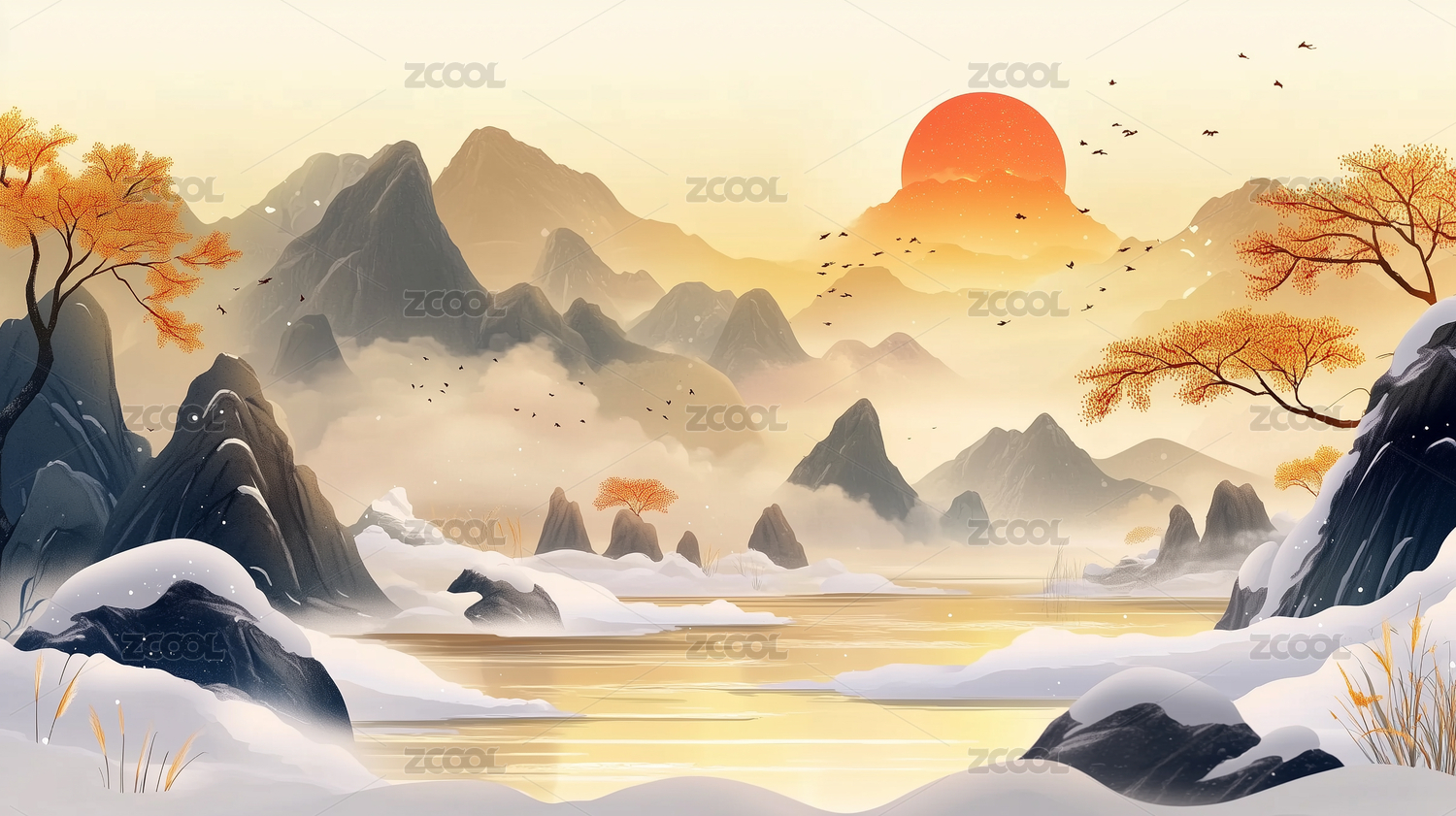 冬季古风山水雪景插画