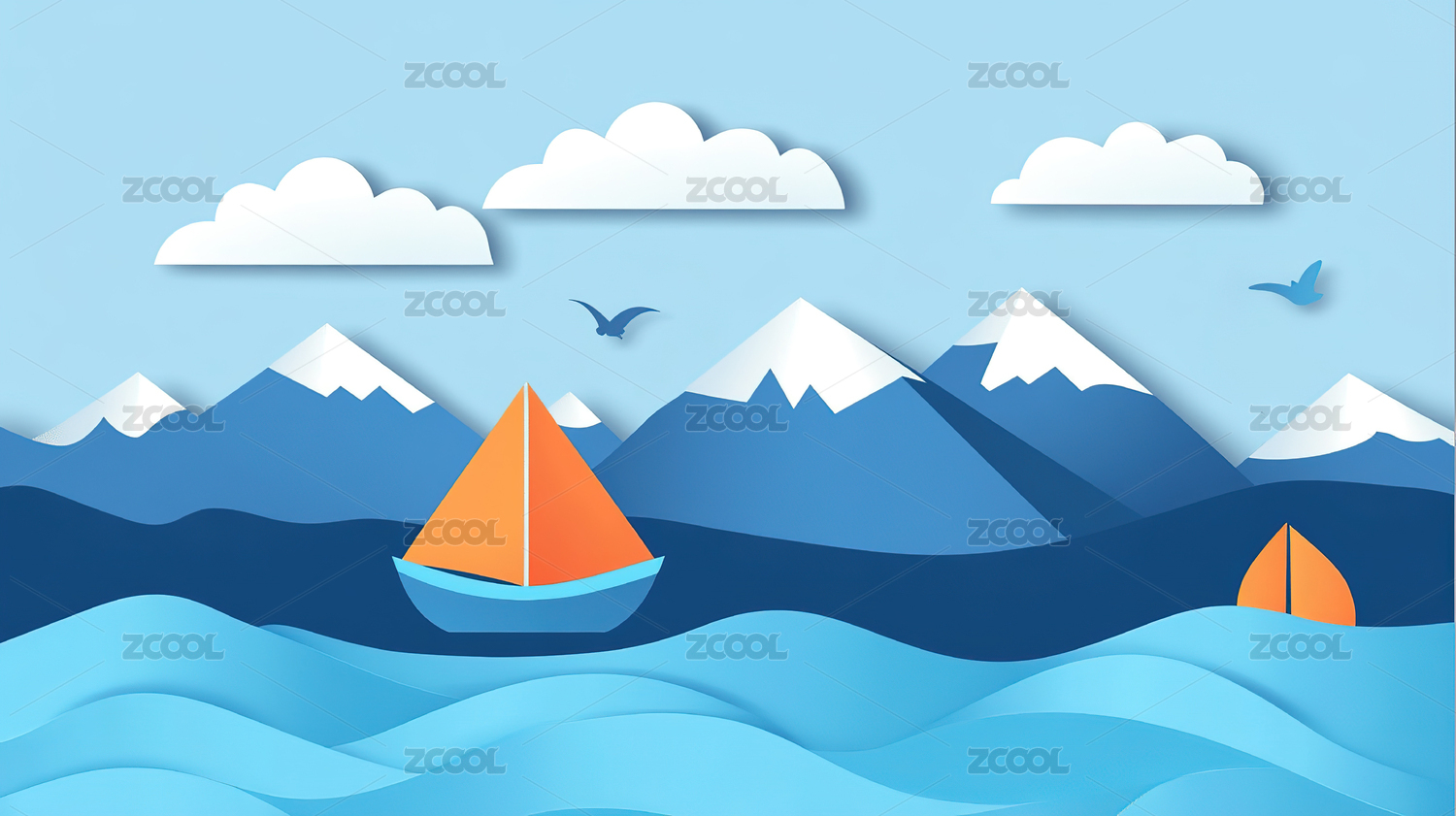 抽象矢量白色折纸船在蓝色海洋里航行背景