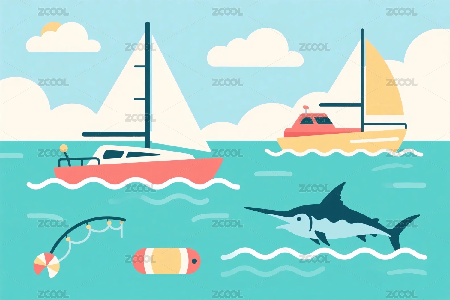 海上帆船与大鱼插画