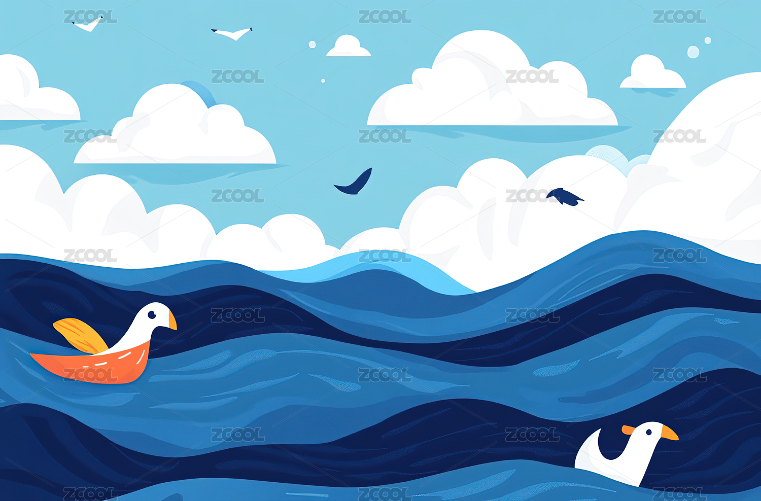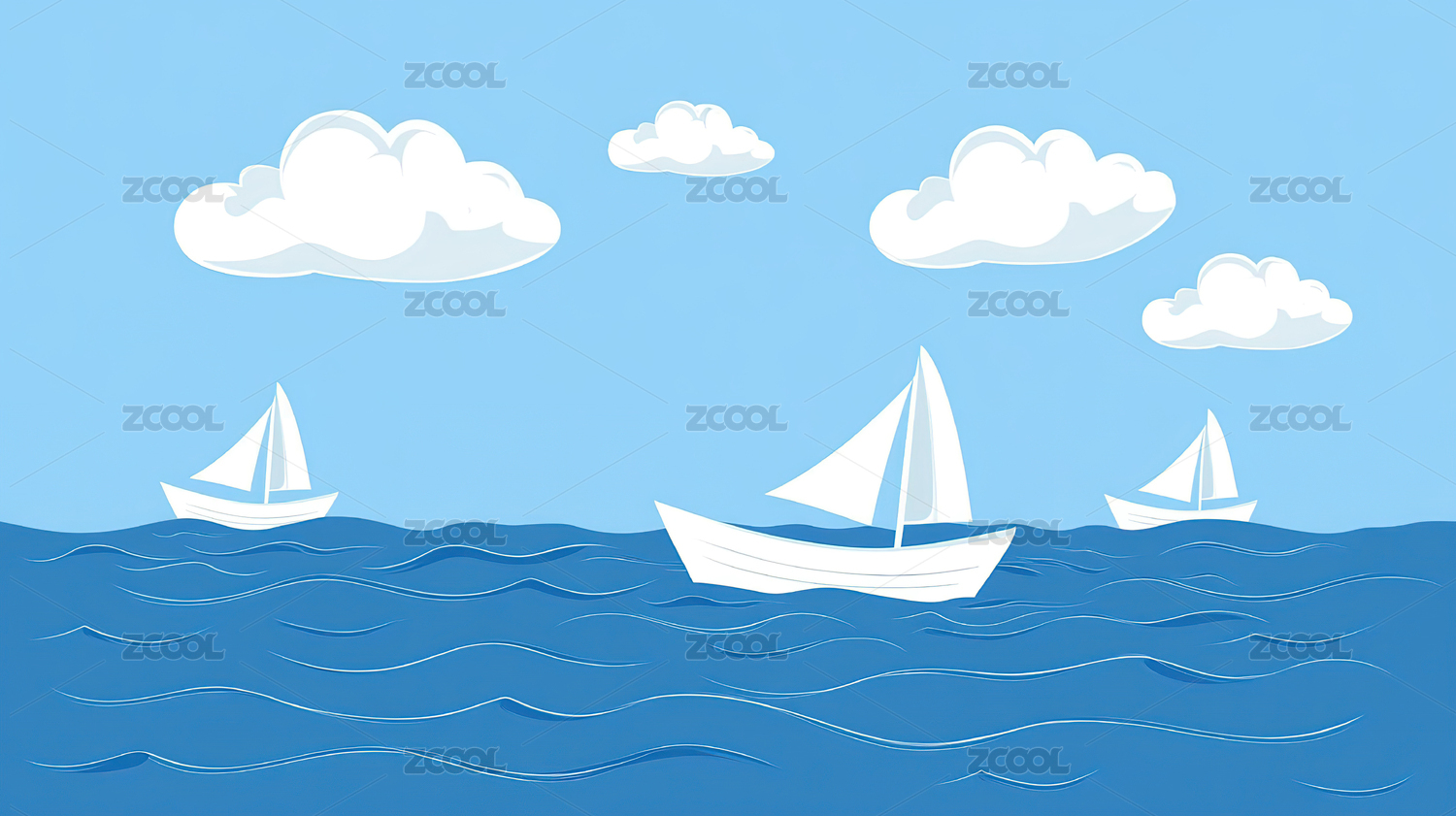 卡通手绘蓝色大海蓝天白云景色插画