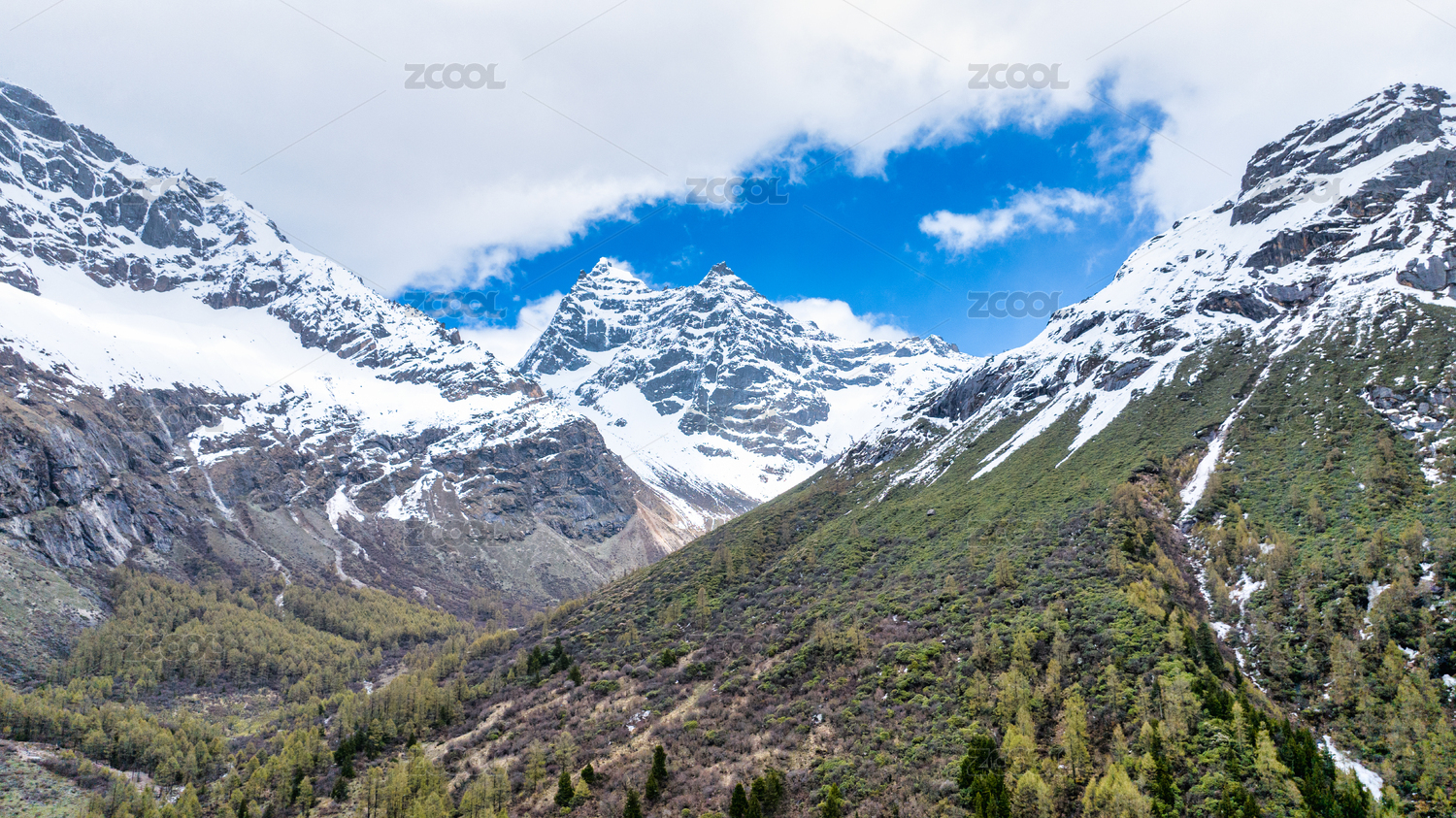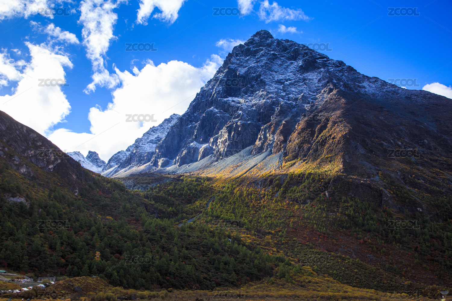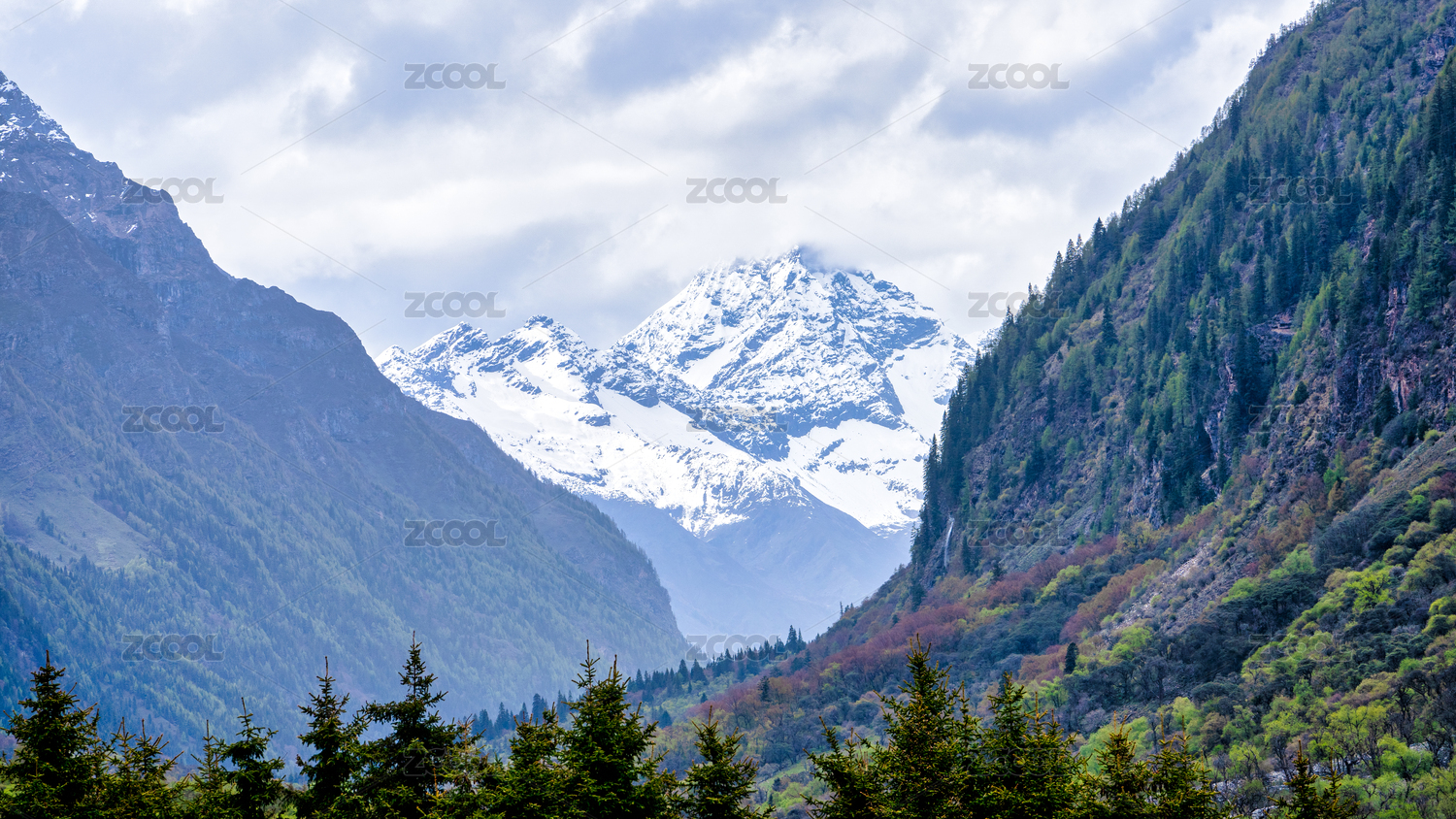 亚洲,中国,四川省,阿坝藏族羌族自治州,四姑娘山,红杉林,雪山,横向,白天,旅游