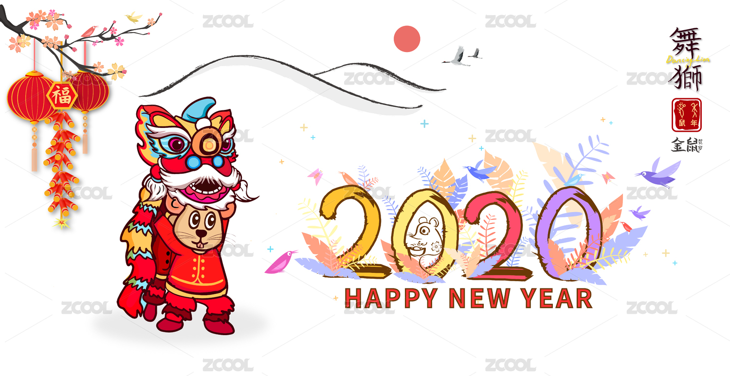 卡通的小老鼠在舞狮,庆祝新年2020年鼠年春节海报插画背景