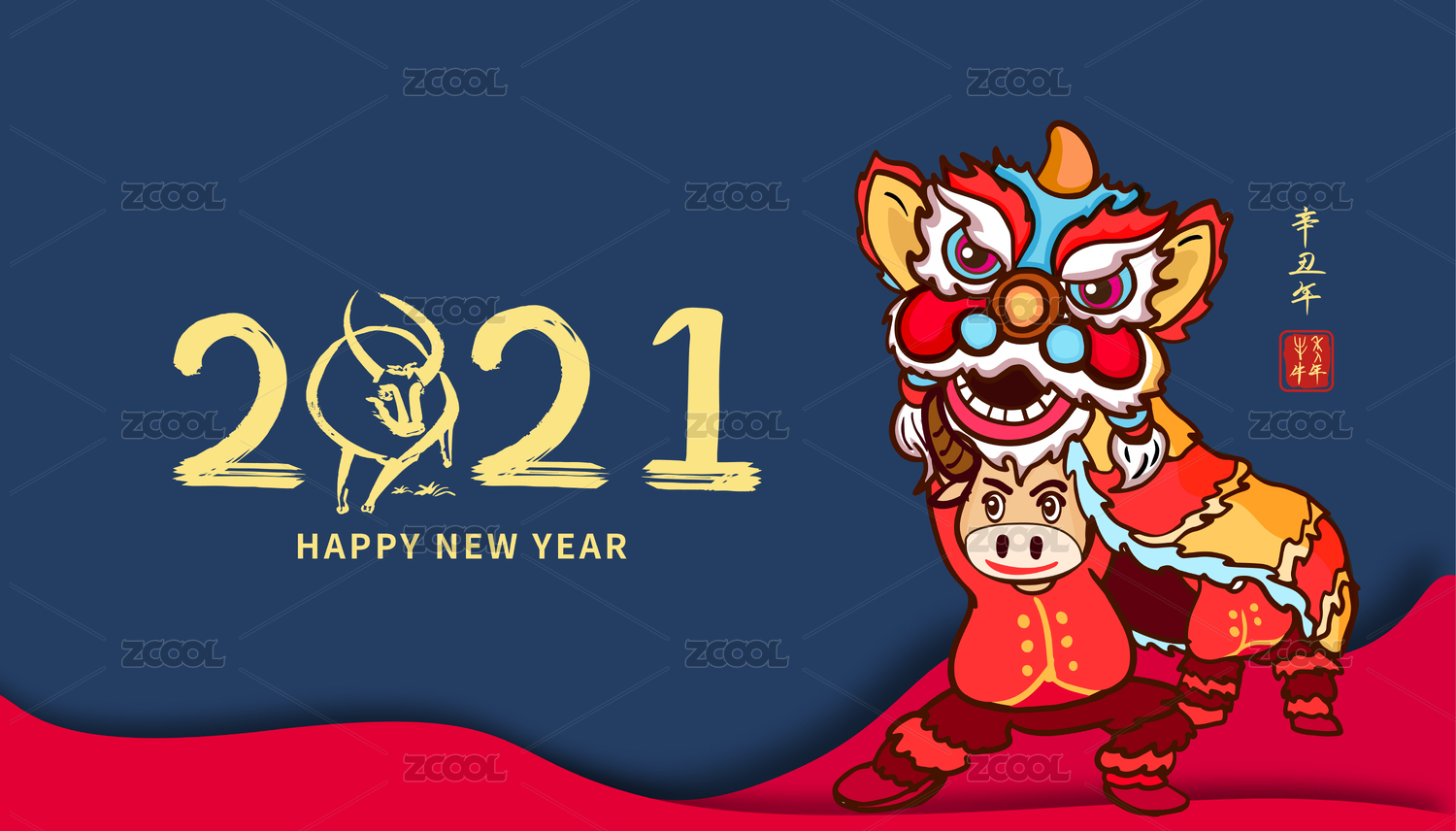新年2021年牛年舞狮庆祝插画