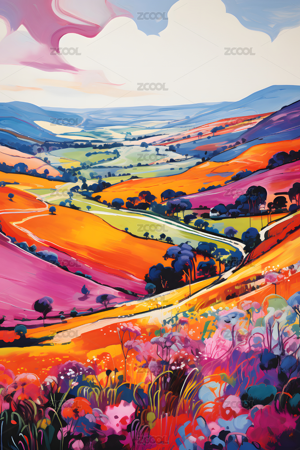 色彩斑斓的花卉山景画