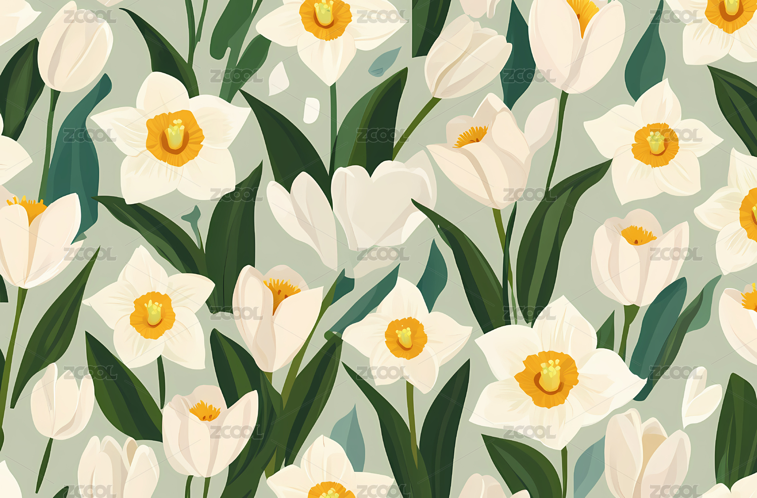 黄色,绿色,水仙花,花,鲜花,盛开,叶子,春天,手绘,插画