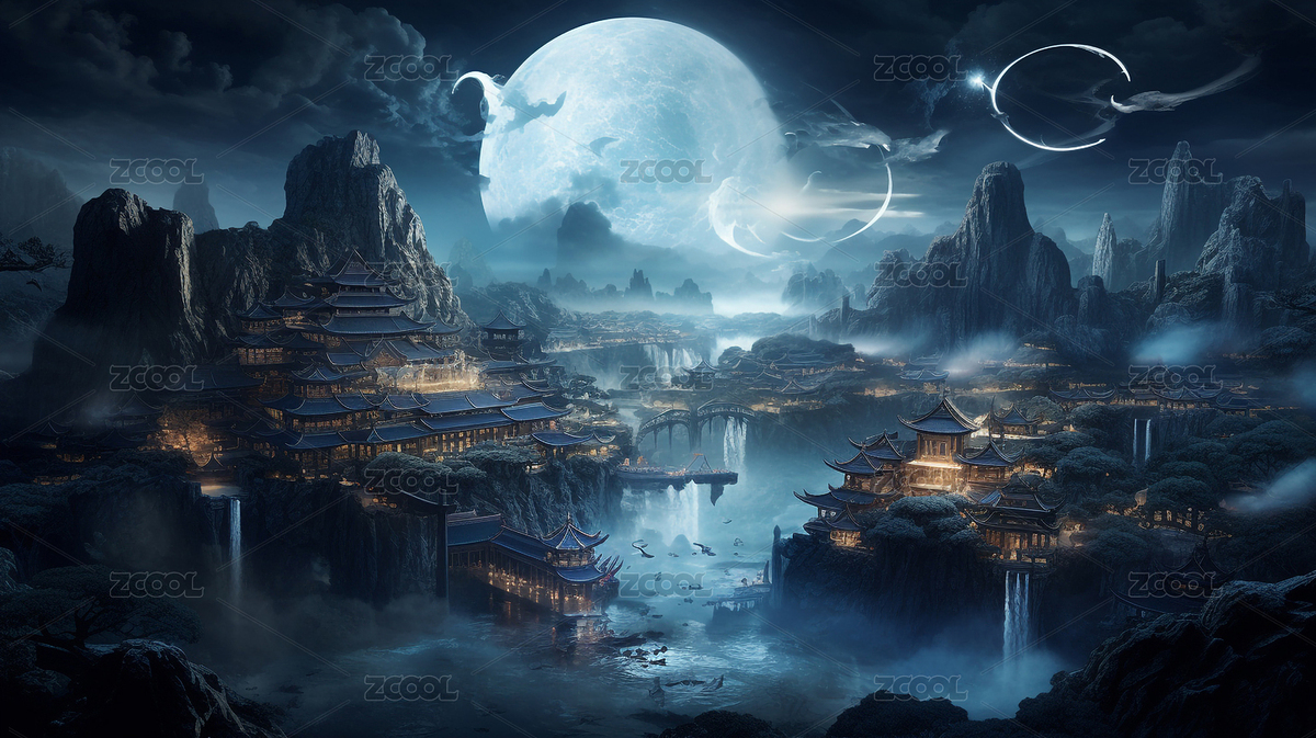 幻想风格,夜景,中国建筑,传统风格,飞檐翘角,多层屋顶,灯光效果,层次分明,山水,和谐共生
