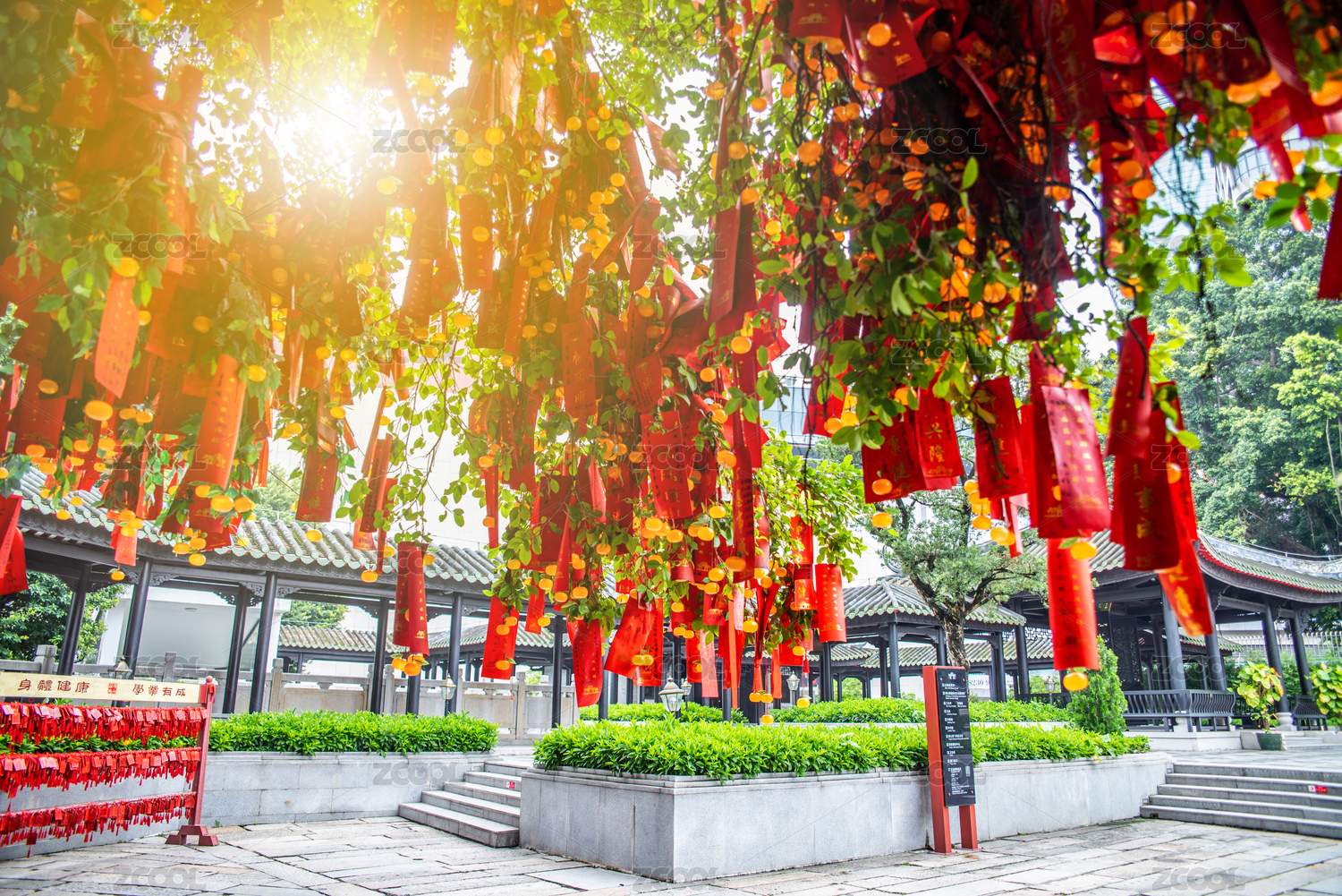 中国广东省佛山祖庙孔圣园内许愿树上挂满的红色许愿带