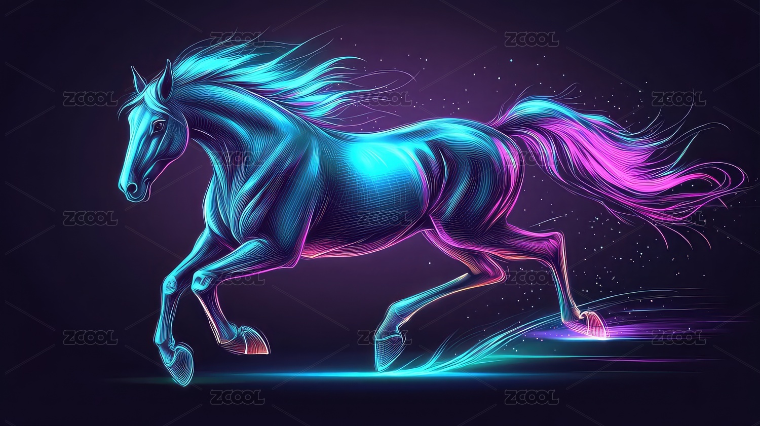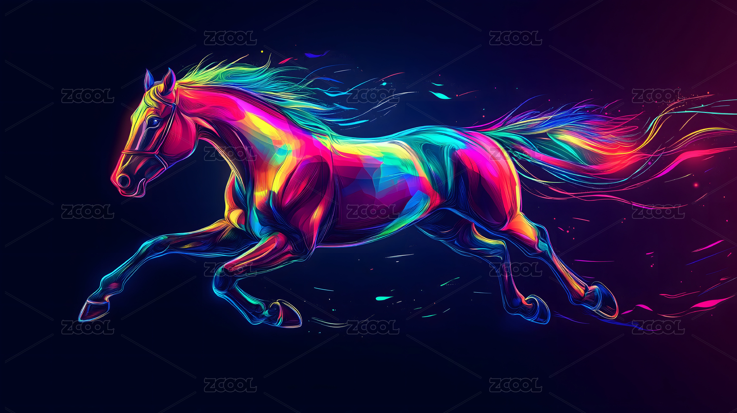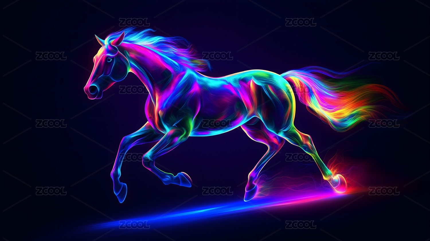 霓虹灯光下的奔跑的马匹图片具有艺术感
