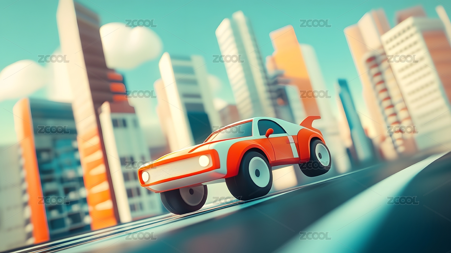 3D卡通风格的小汽车行驶在公路上