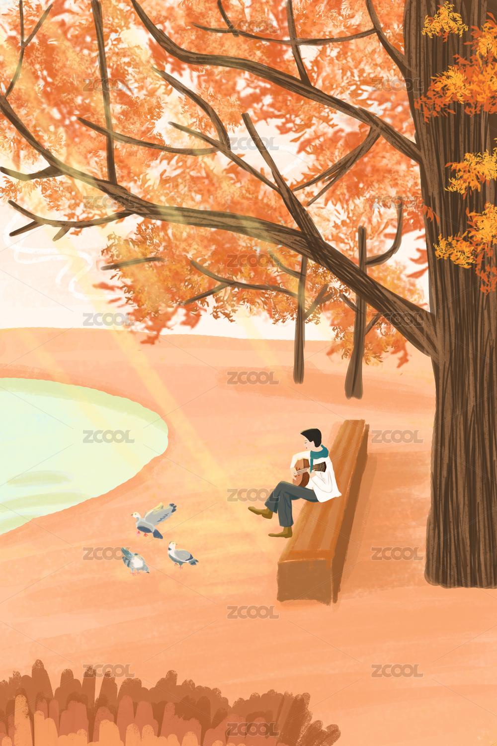 秋日湖边弹吉他的男人
