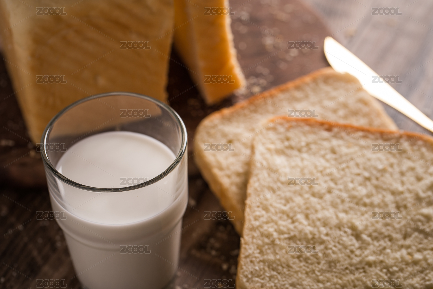 木纹桌子上的吐司面包牛奶