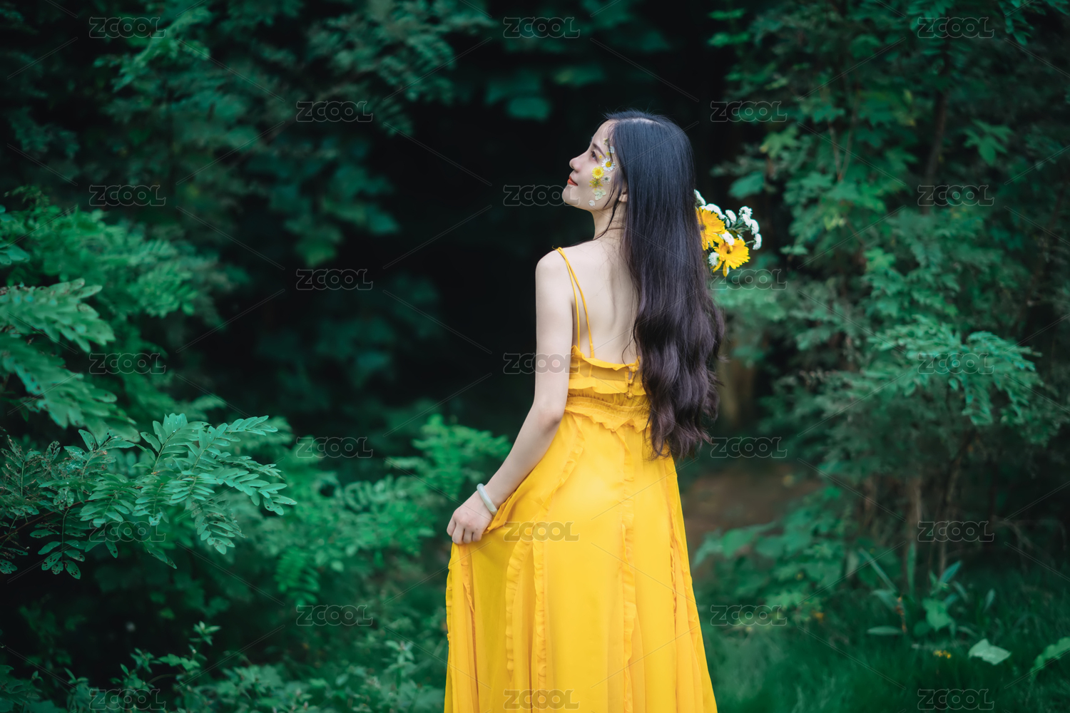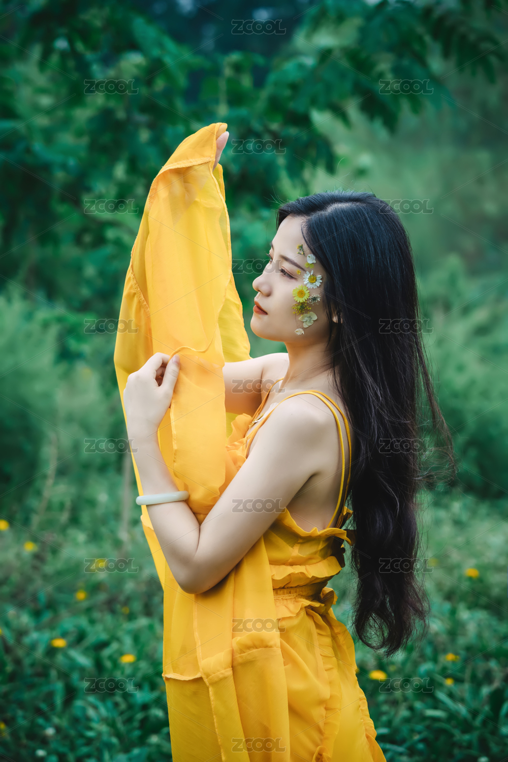 穿黄裙子举起黄色面纱的美丽女孩人像