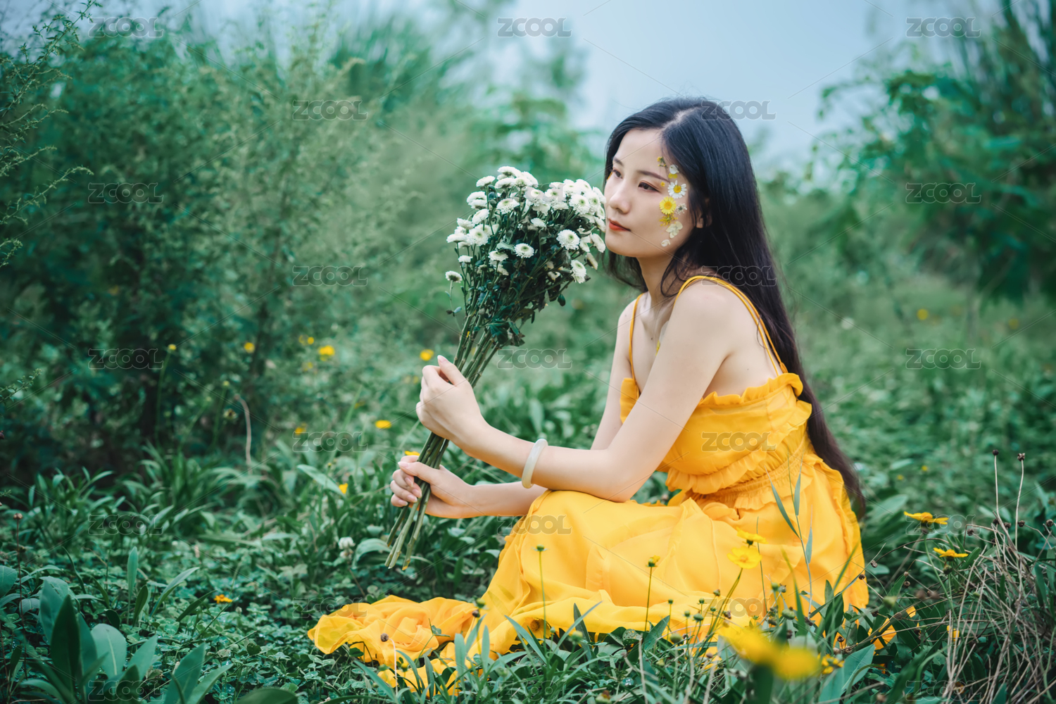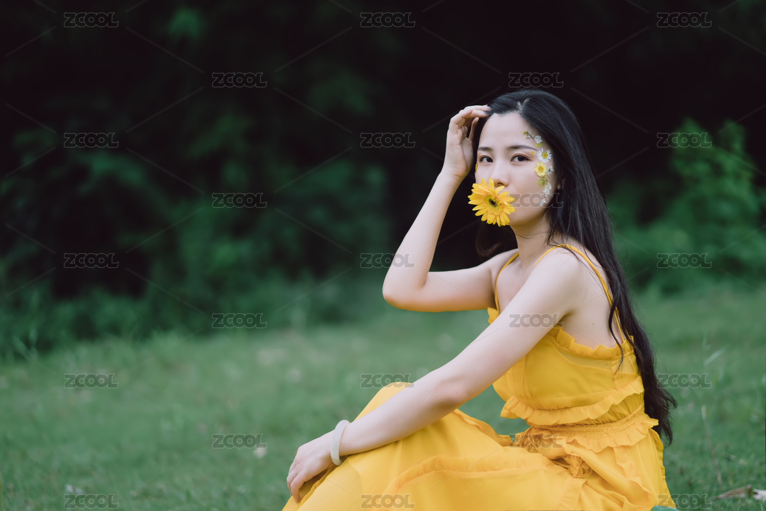 穿黄裙子手拿鲜花坐在草坪上的美丽女孩人像