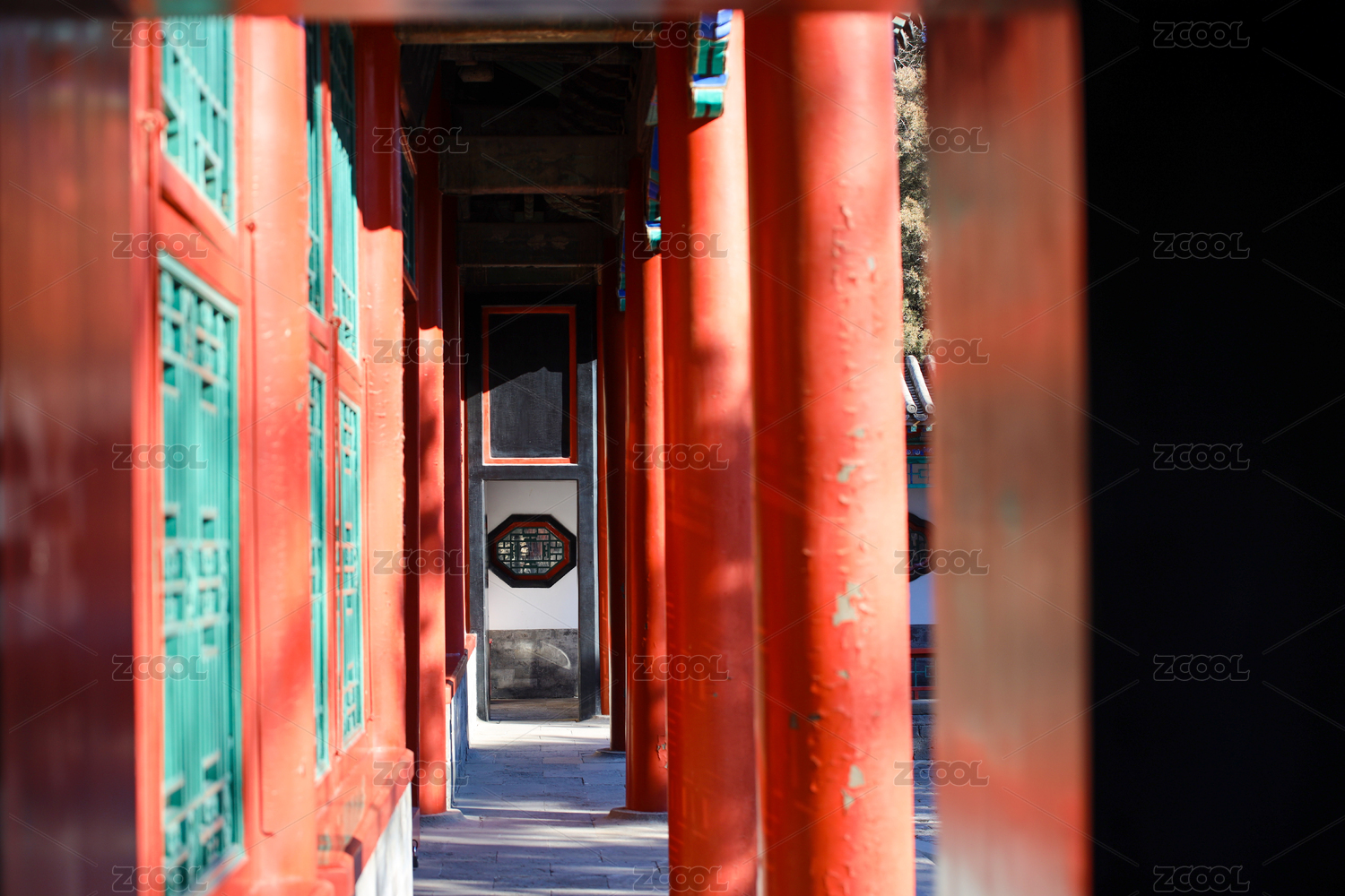 阳光照进中式建筑的长廊里