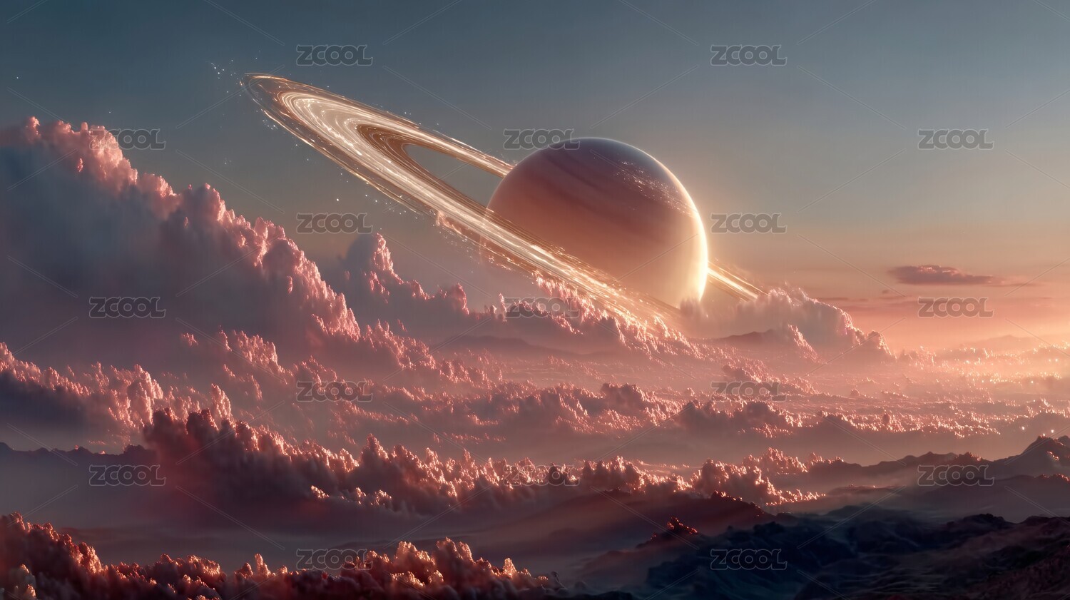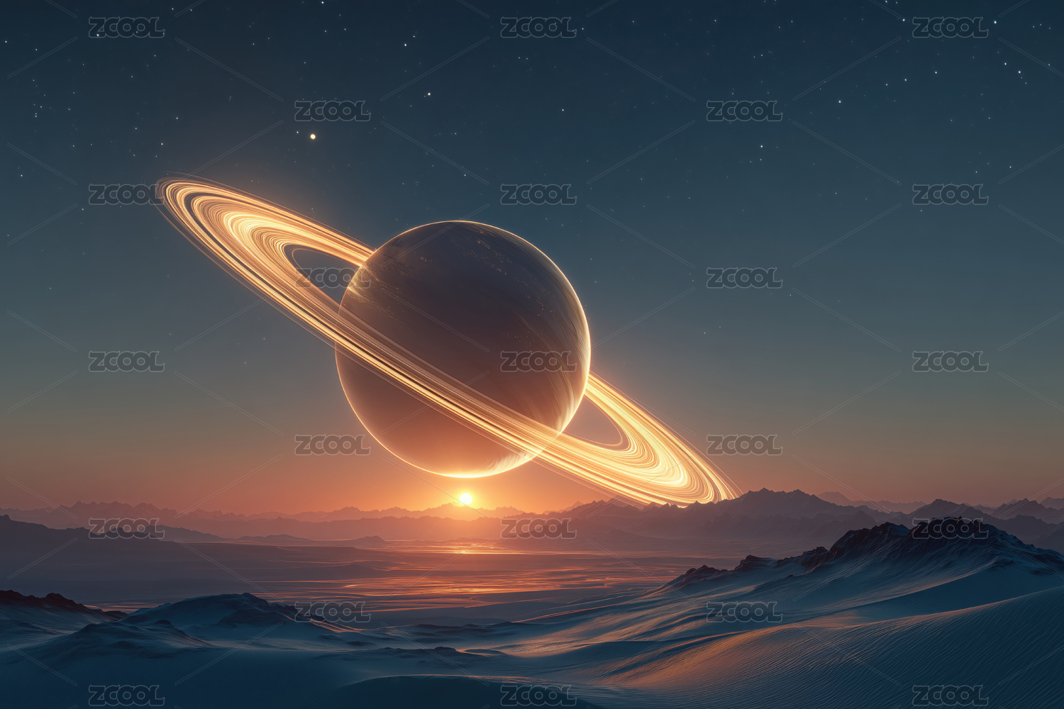 巨大的土星悬浮在山峦之巅
