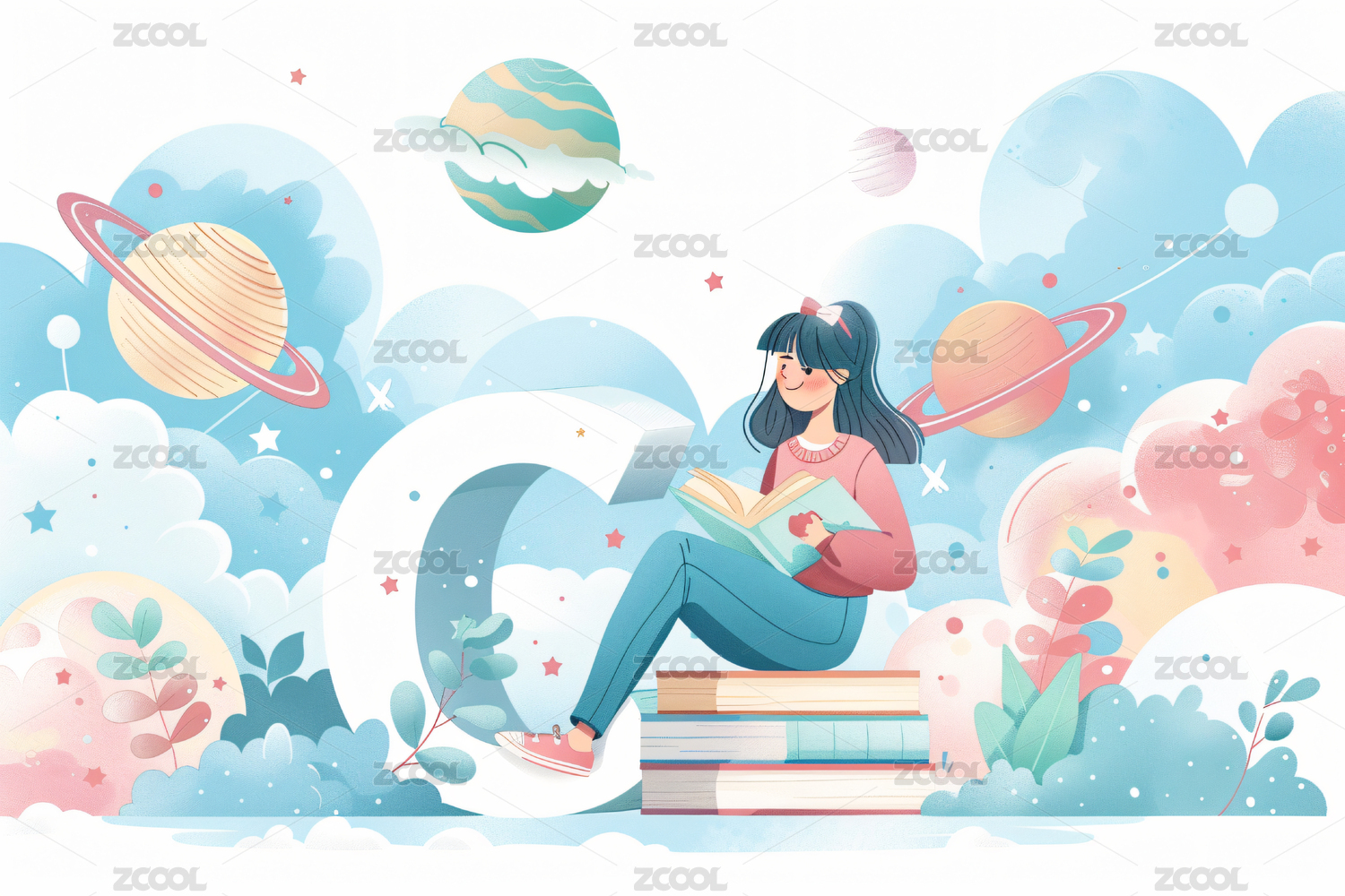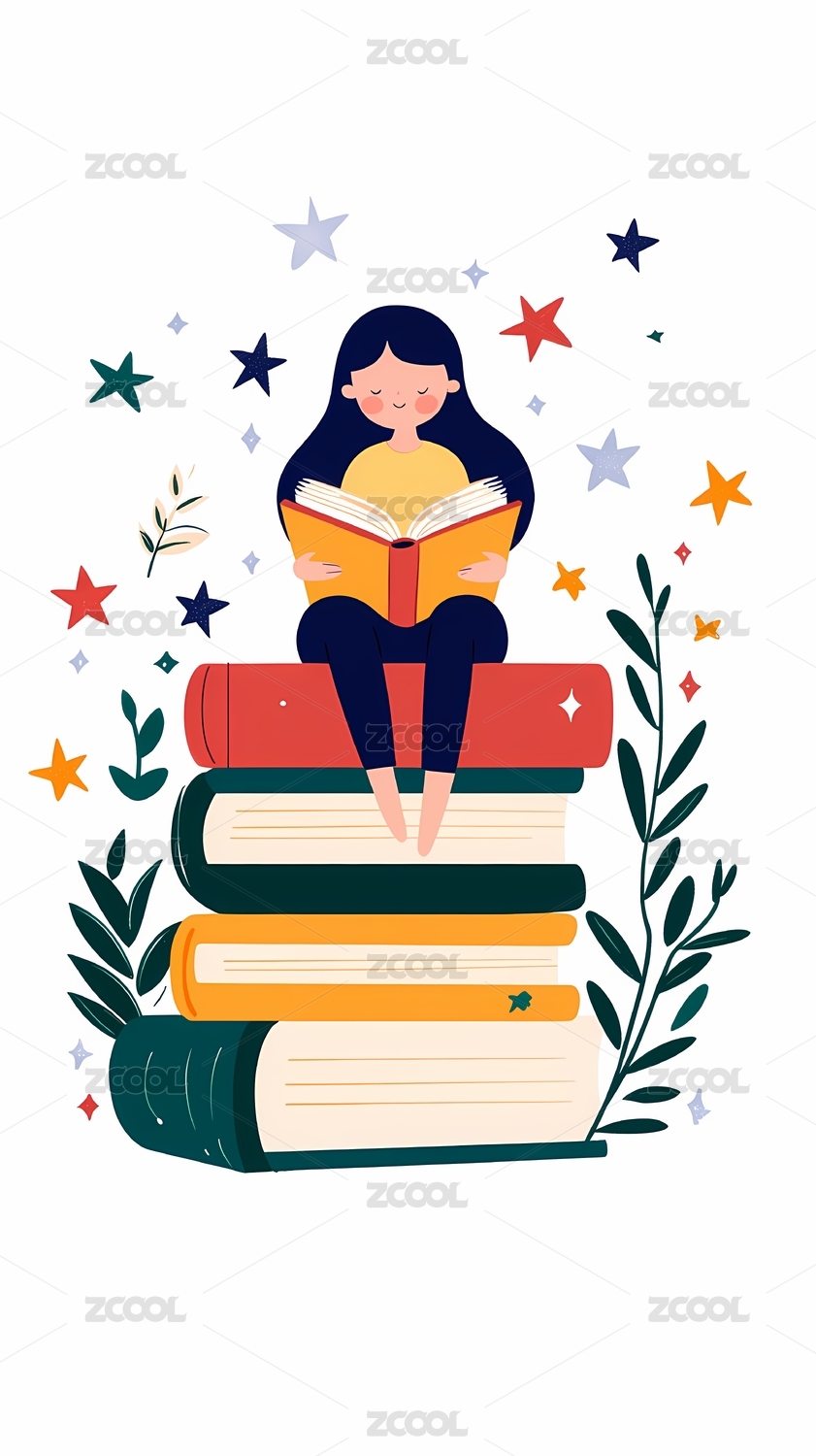 矢量插画坐在书堆上看书阅读学习书本的女孩