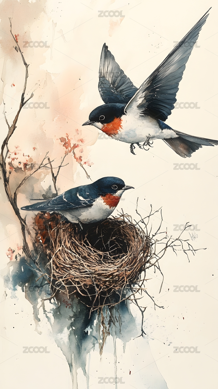 中国风,水墨,水彩,插画,意境,节气,春天,竹子,小鸟,春分