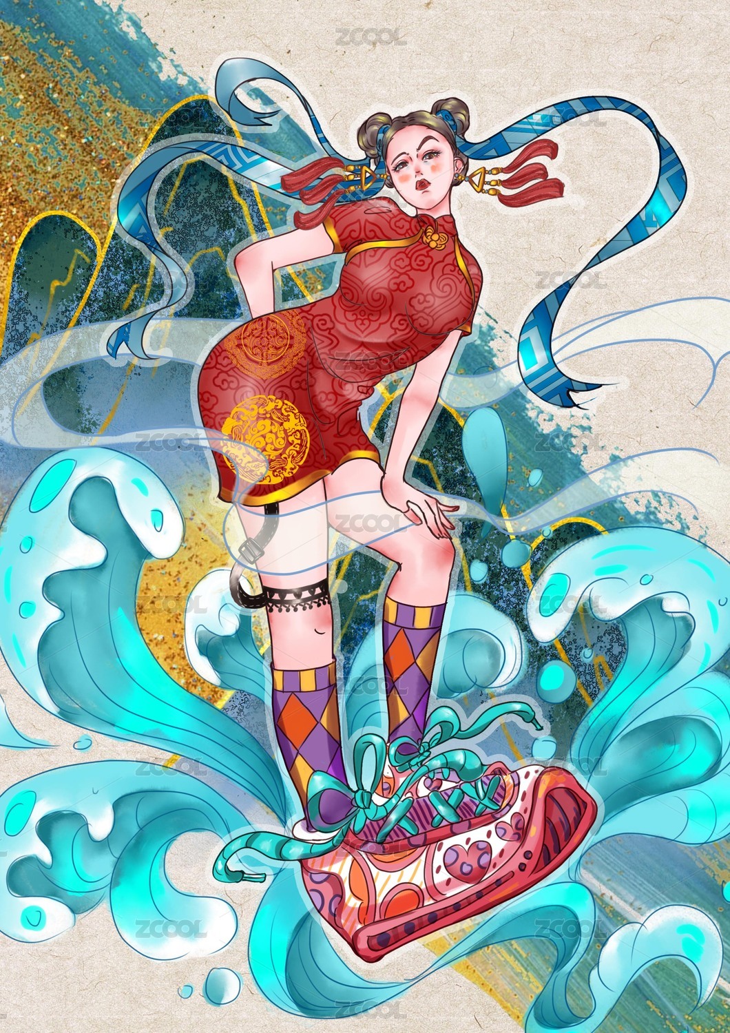 国潮,卡通,女孩,节气,新年,自媒体,插画,卡牌,红色,过年