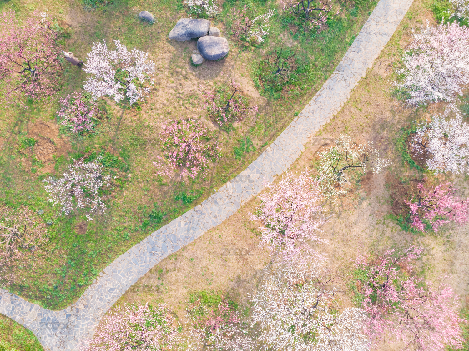 航拍江苏省南京市春季五彩斑斓梅花花海