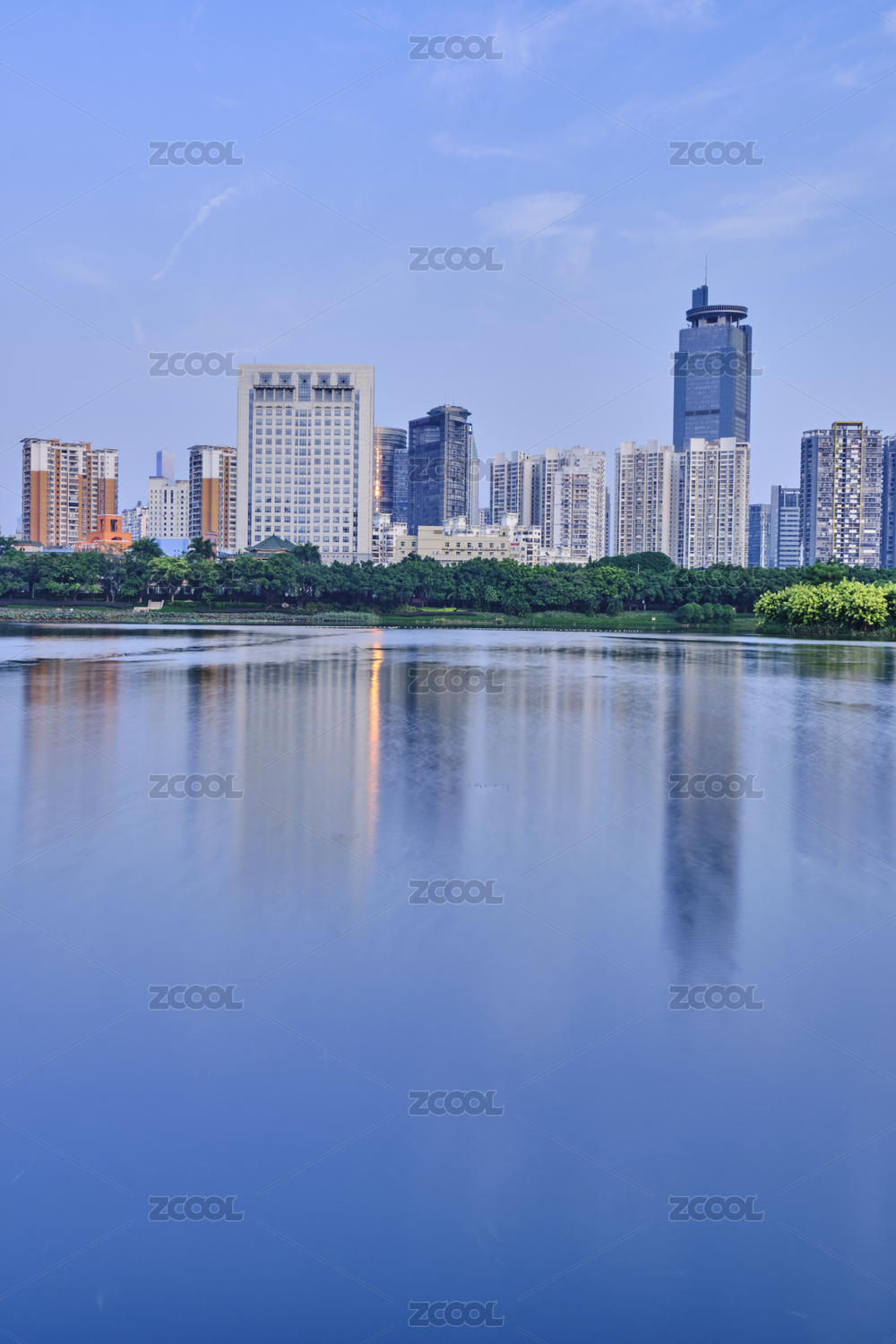 南宁南湖公园夕阳黄昏与城市摩天大楼建筑