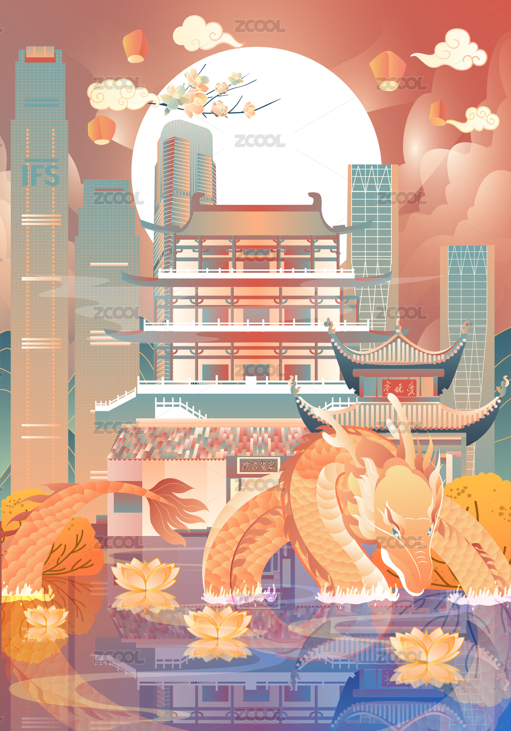 双龙戏珠洛阳建筑竖版国风矢量插画