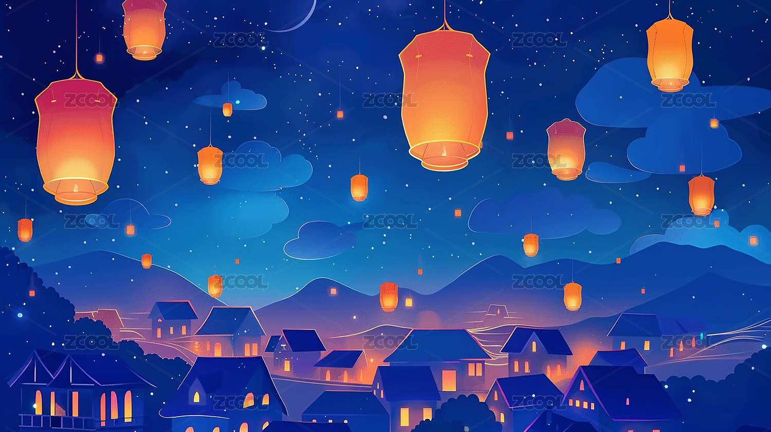 夜晚树上挂着灯笼,远处是红瓦白墙的古建筑