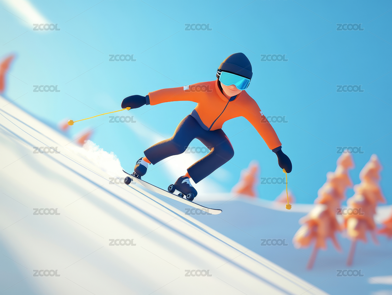 卡通风格滑雪运动员在雪坡上滑行滑雪,运动