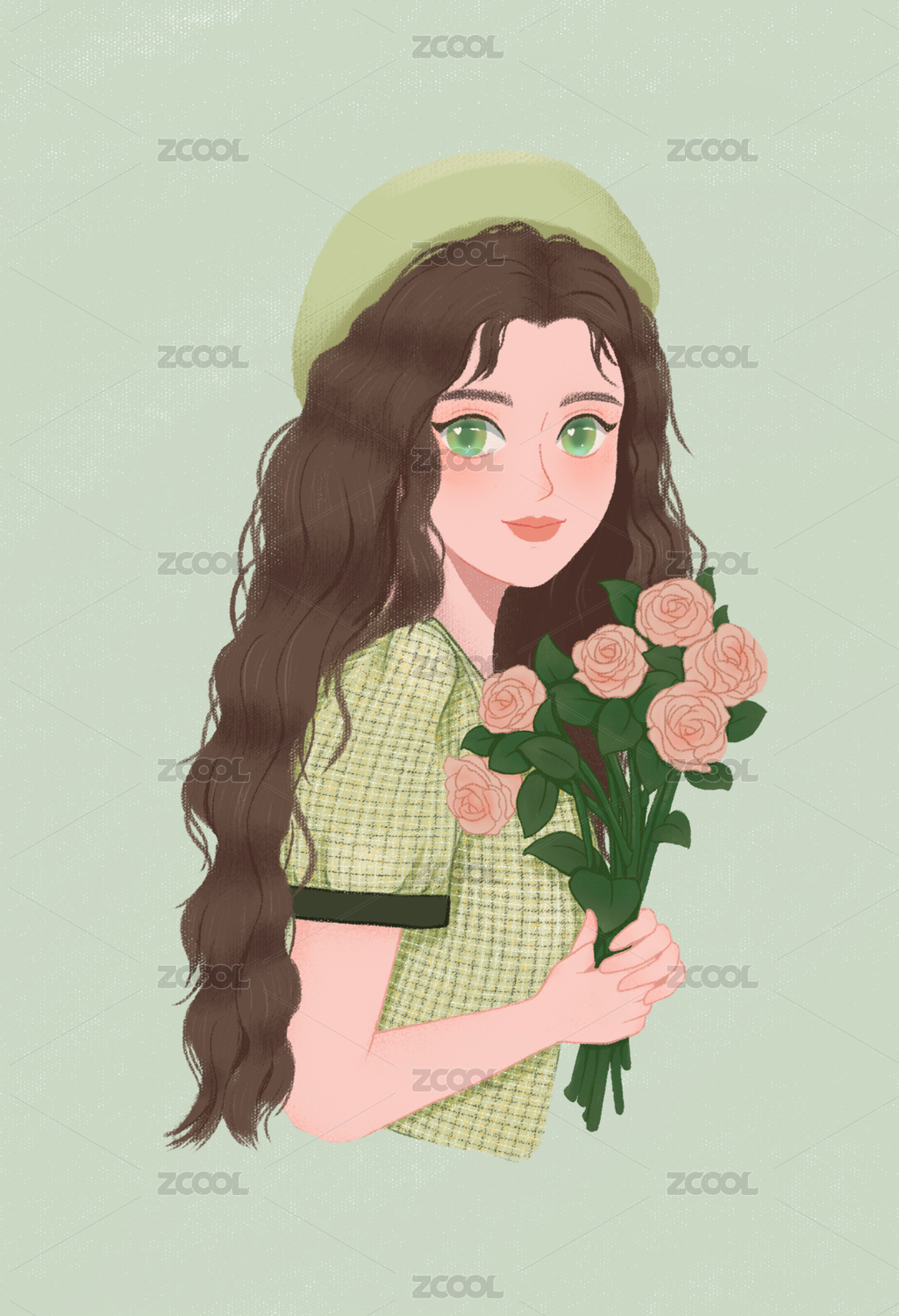 绿色卷发粉色玫瑰帽子美女手捧花针织衫气质