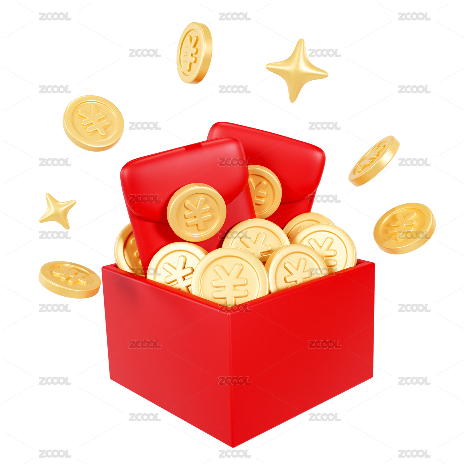 3D渲染的打开的红色礼盒红包金币优惠券礼