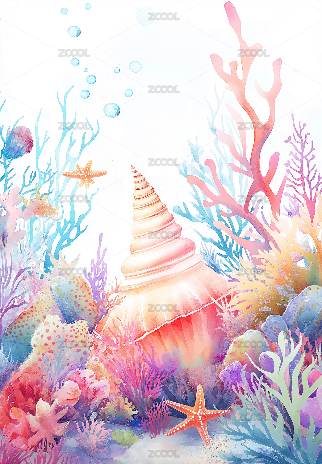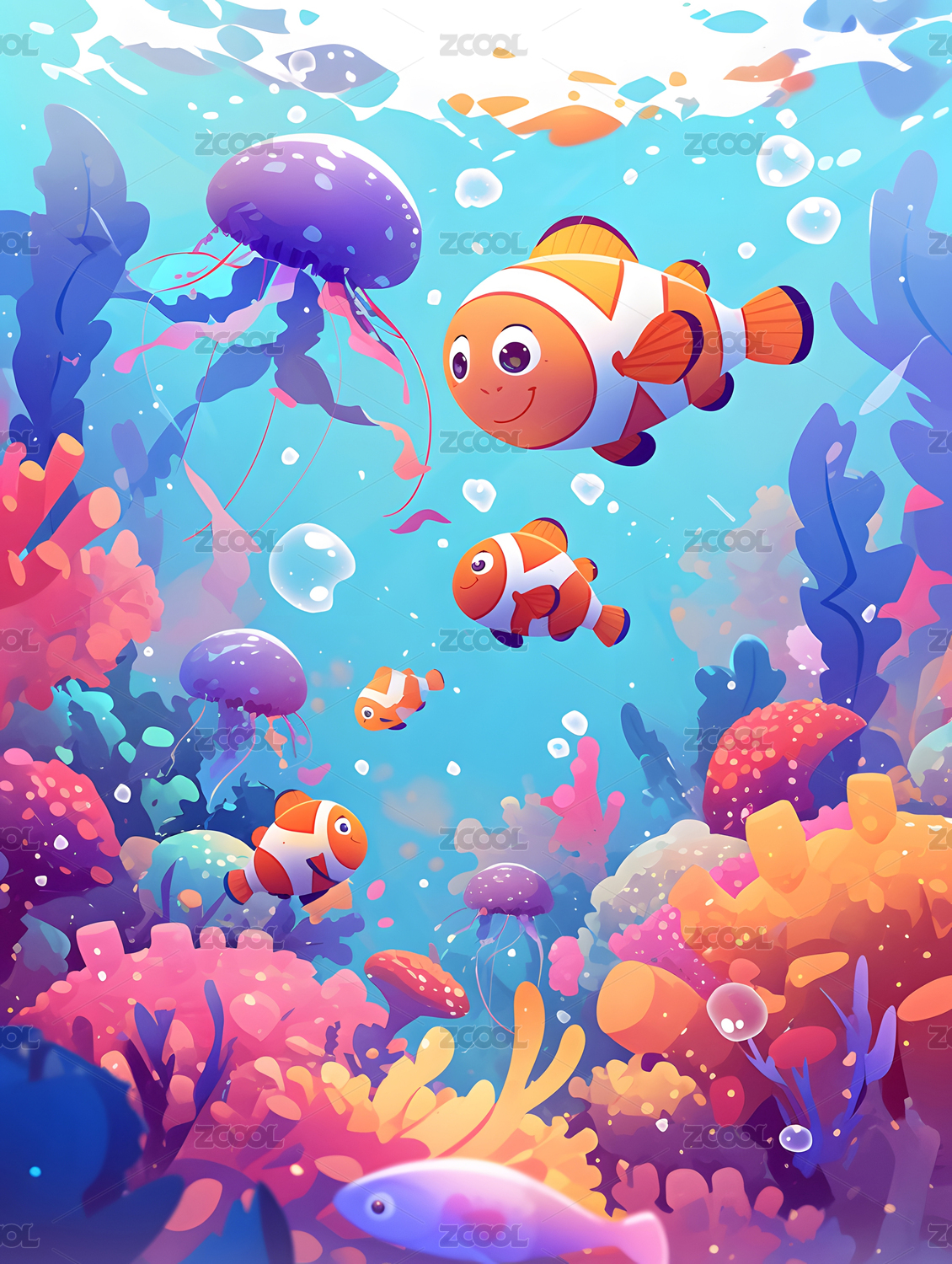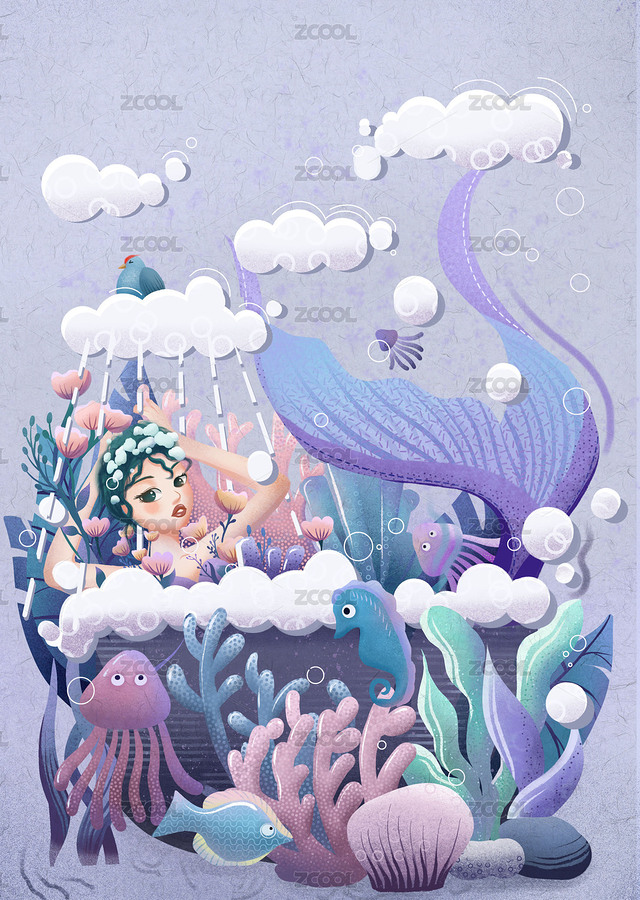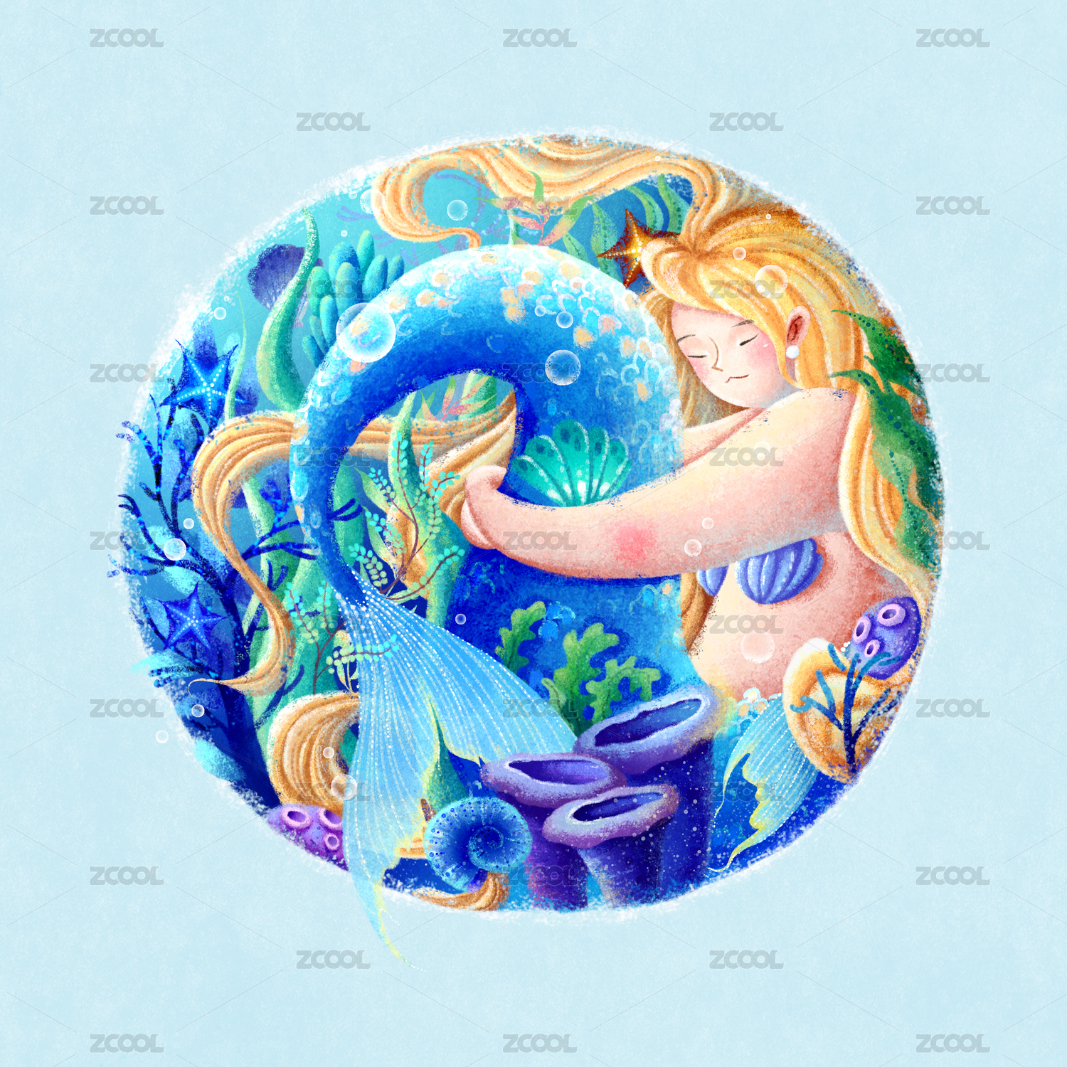 美人鱼与泡泡海底猴子鱼群珊瑚礁石多彩插画