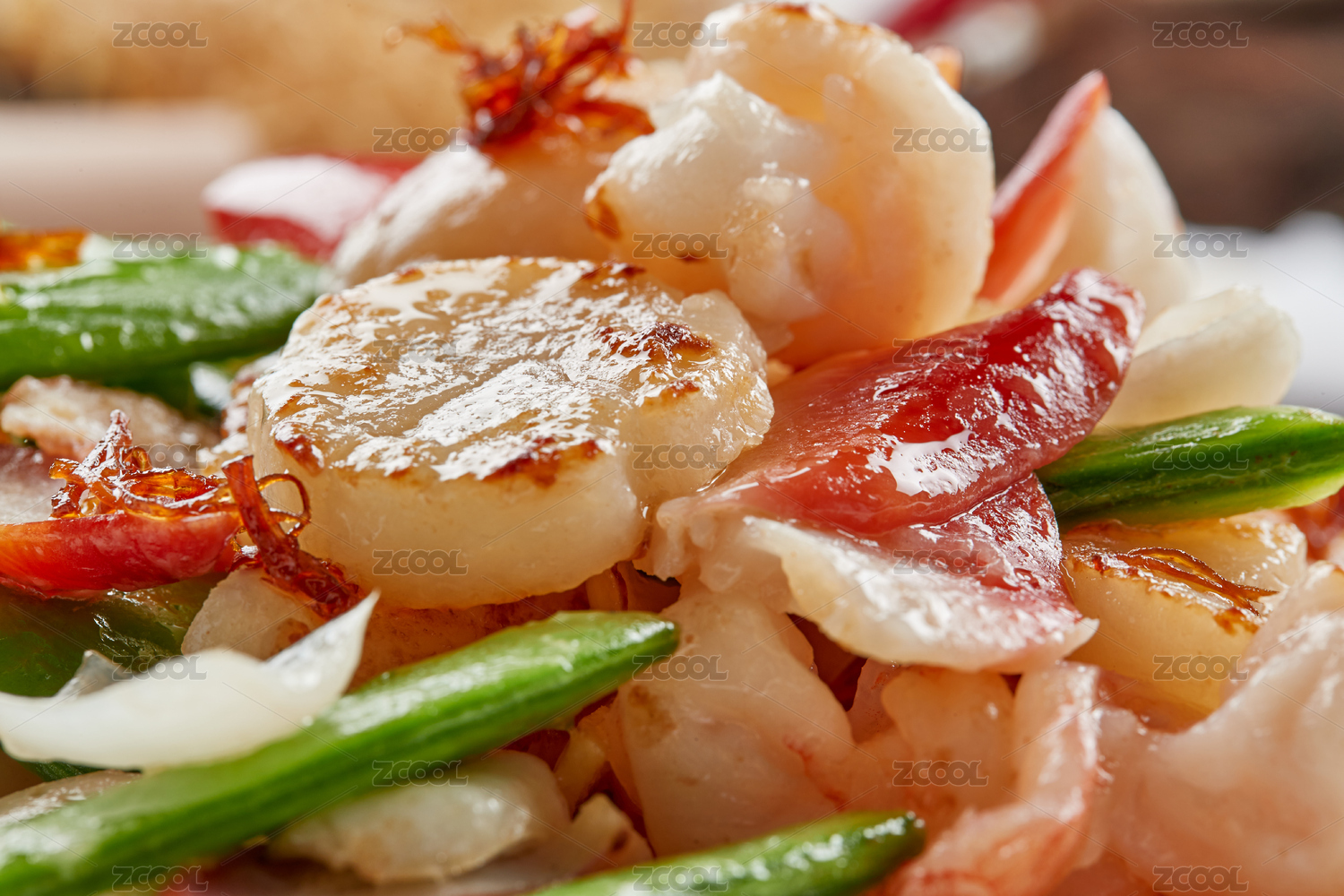 白色瓷盘装的的粤式小炒蜜豆炒海鲜