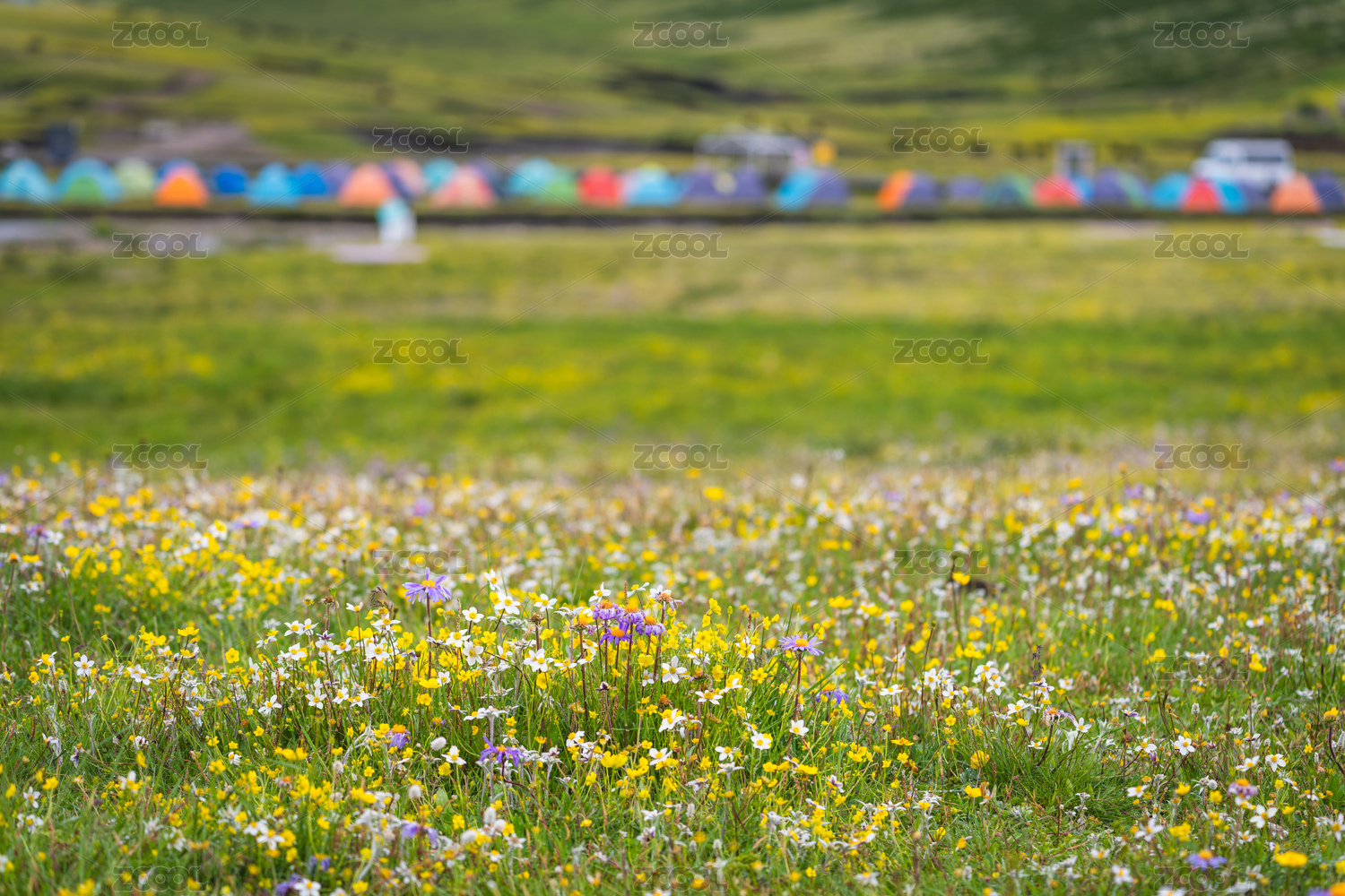 四川阿坝黑水县春天的绽放紫色野花的草坪
