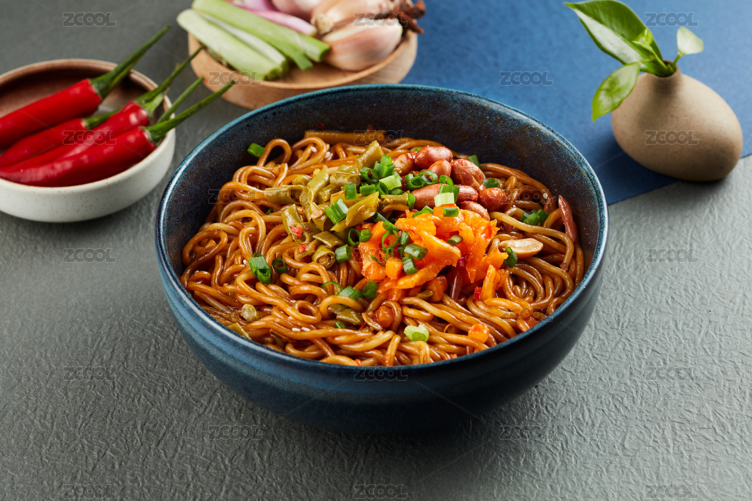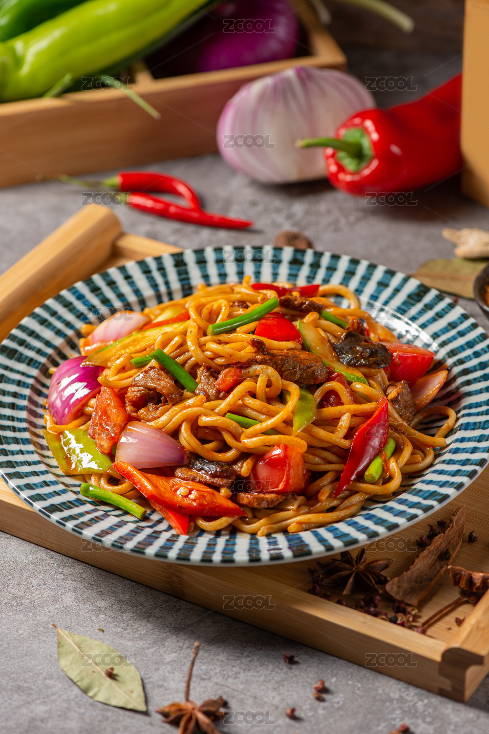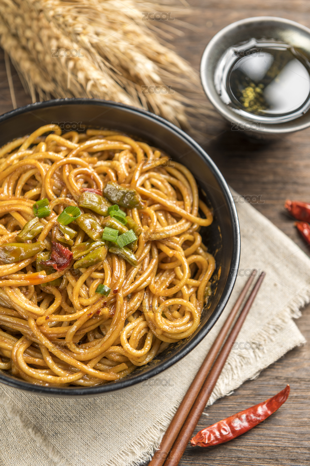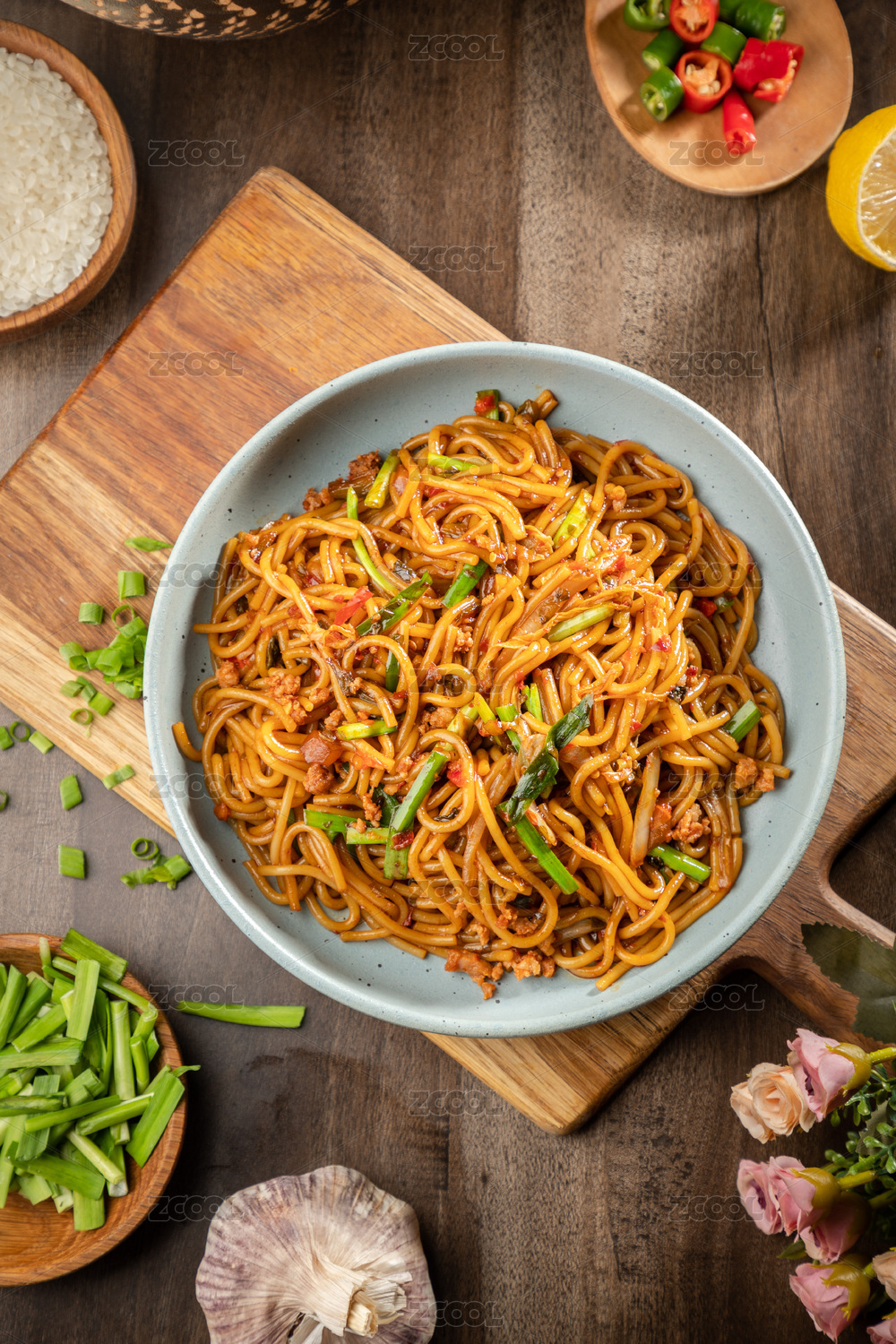 炒米线,肉末,辣子,辣椒段,糟辣子,米线,韭菜叶,筷子,挑,挑面