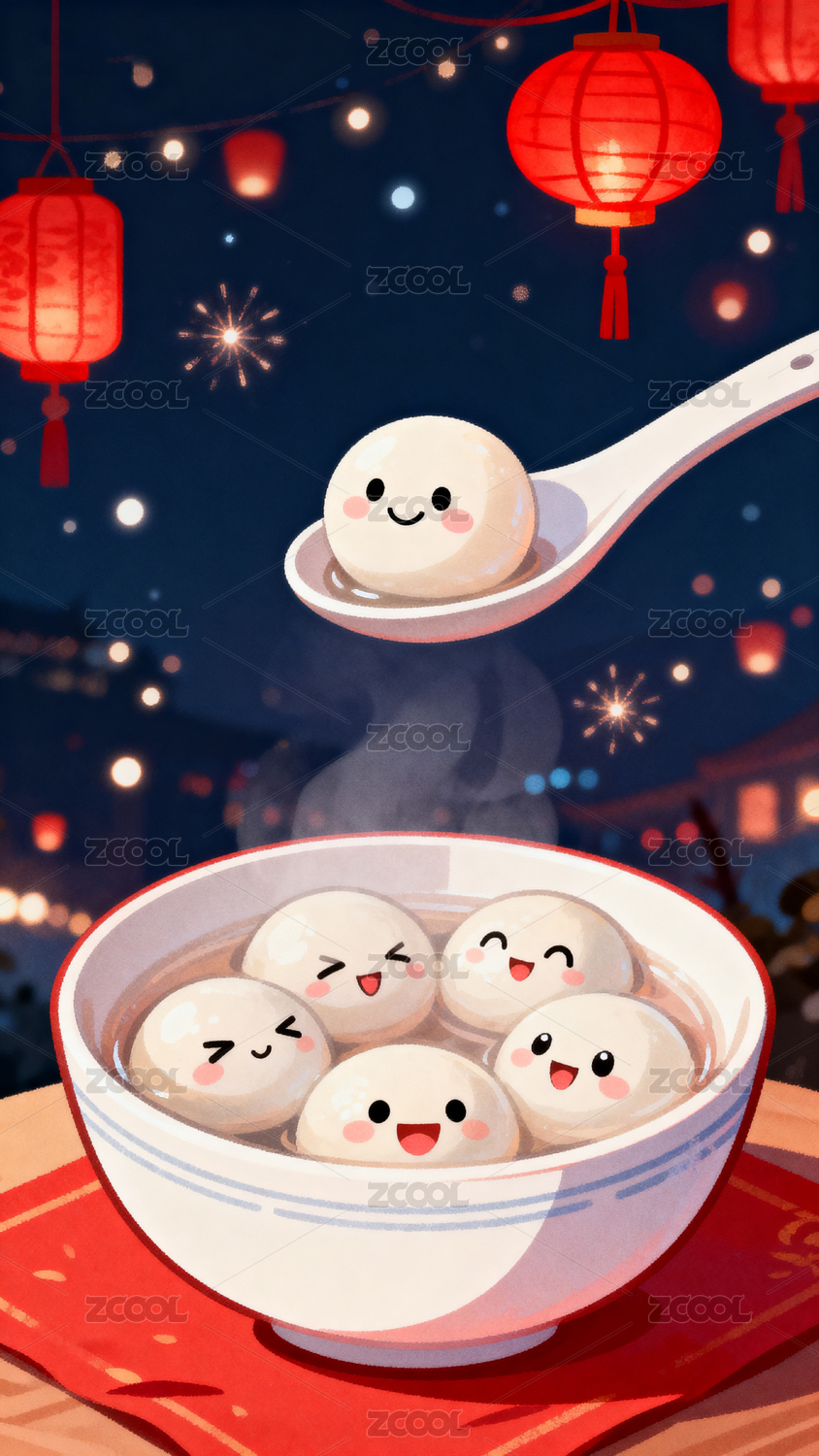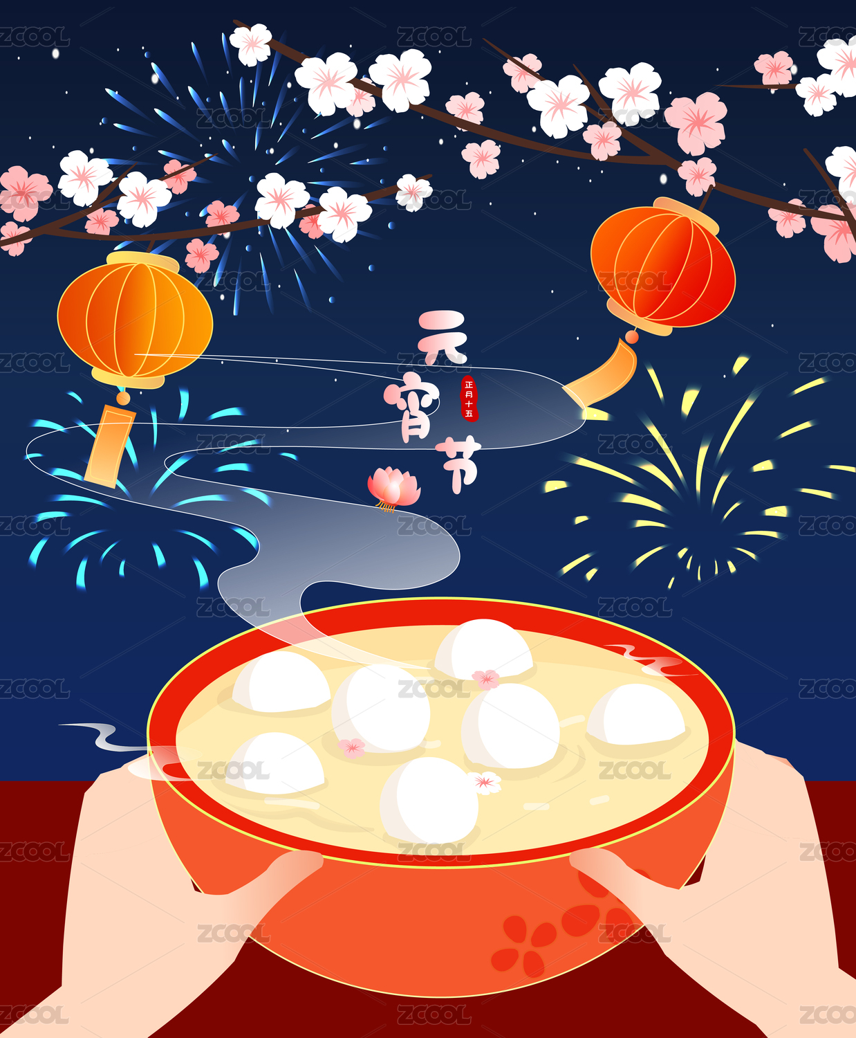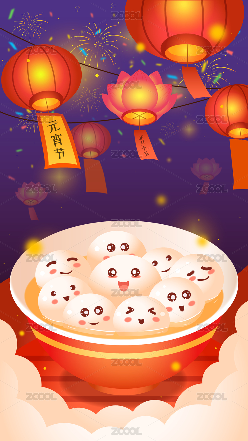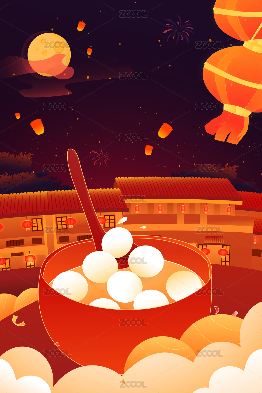 元宵佳节一碗汤圆和灯笼猜灯谜等国潮风插画