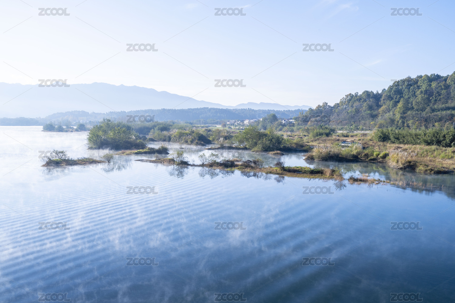 中国安徽泾县 青义江晨雾江景自然风光