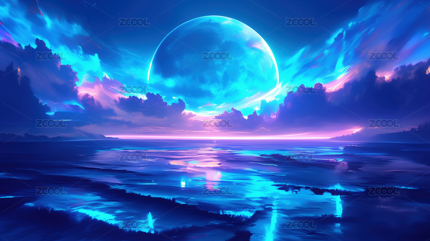 粉色月亮和云彩倒映在水面上的唯美夜景