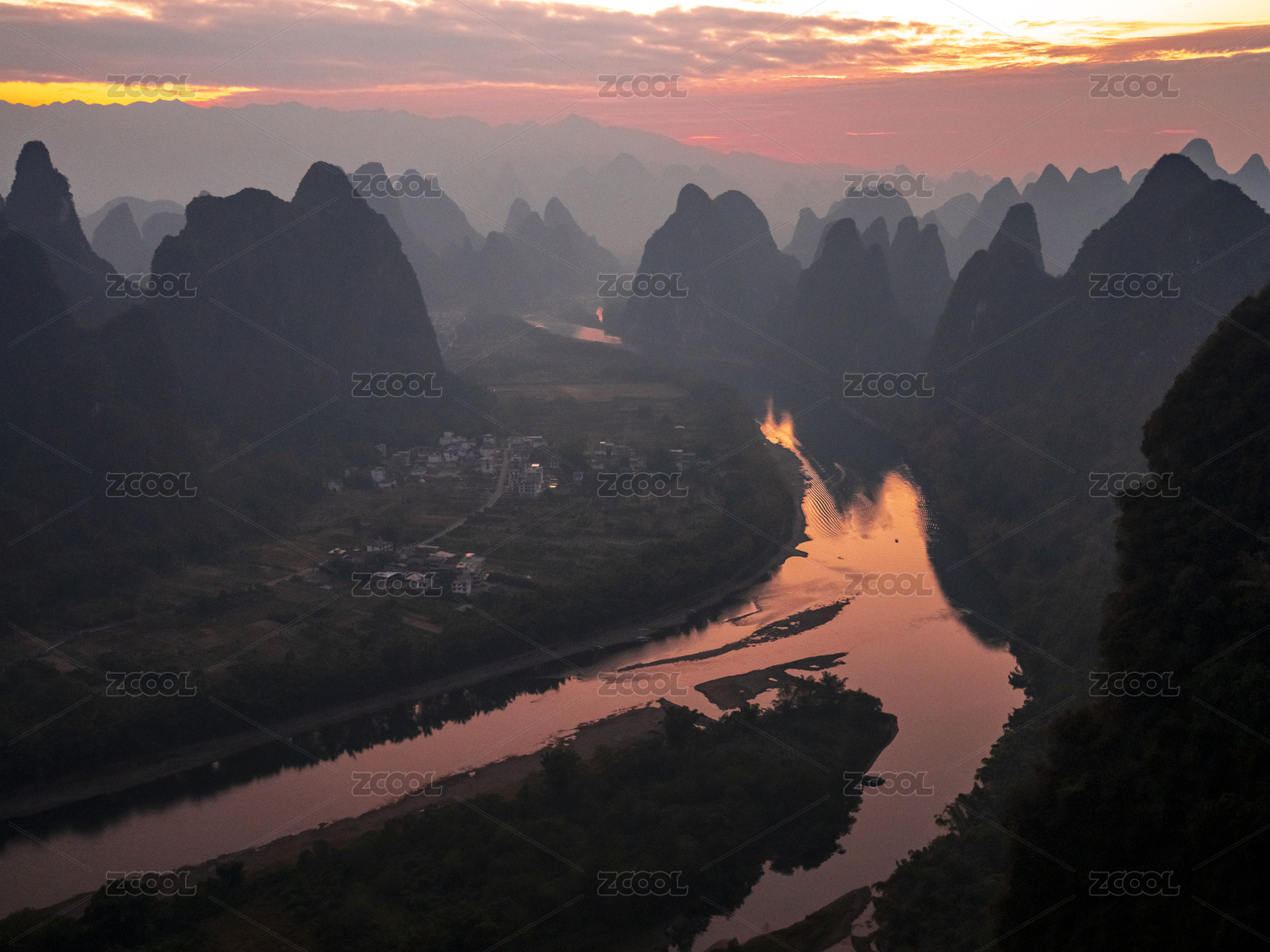 广西桂林漓江兴坪镇漓江两岸晚霞