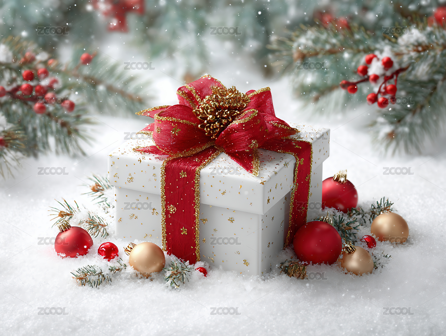 雪地中的红色圣诞礼物