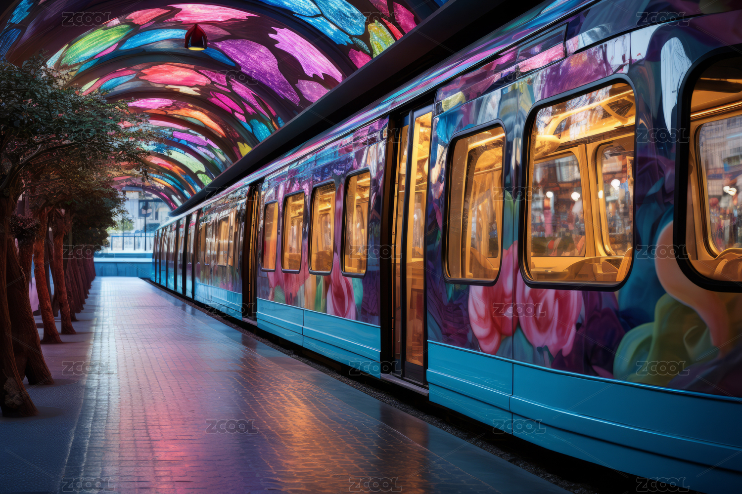 现代地铁列车在色彩斑斓的站台