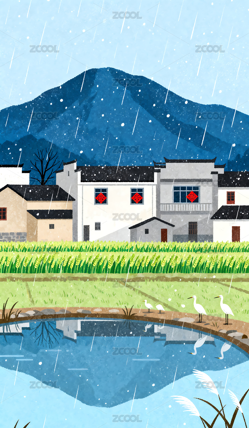 水彩风格的中国乡村田园画