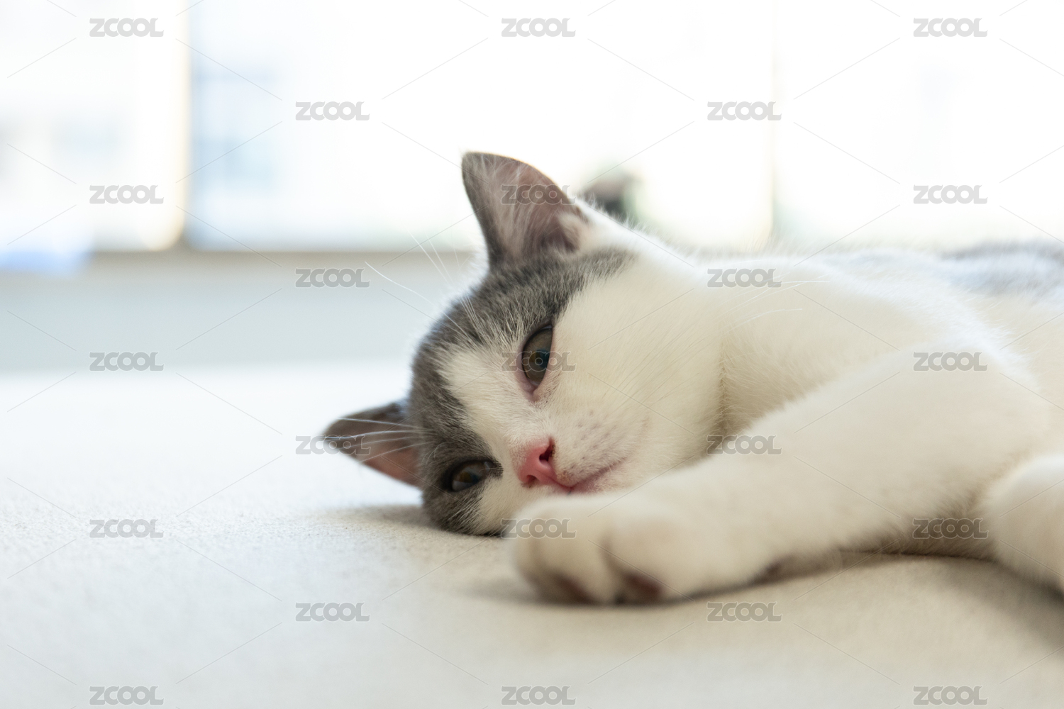 一只可爱的蓝白猫小猫咪在沙发上坐躺着休息