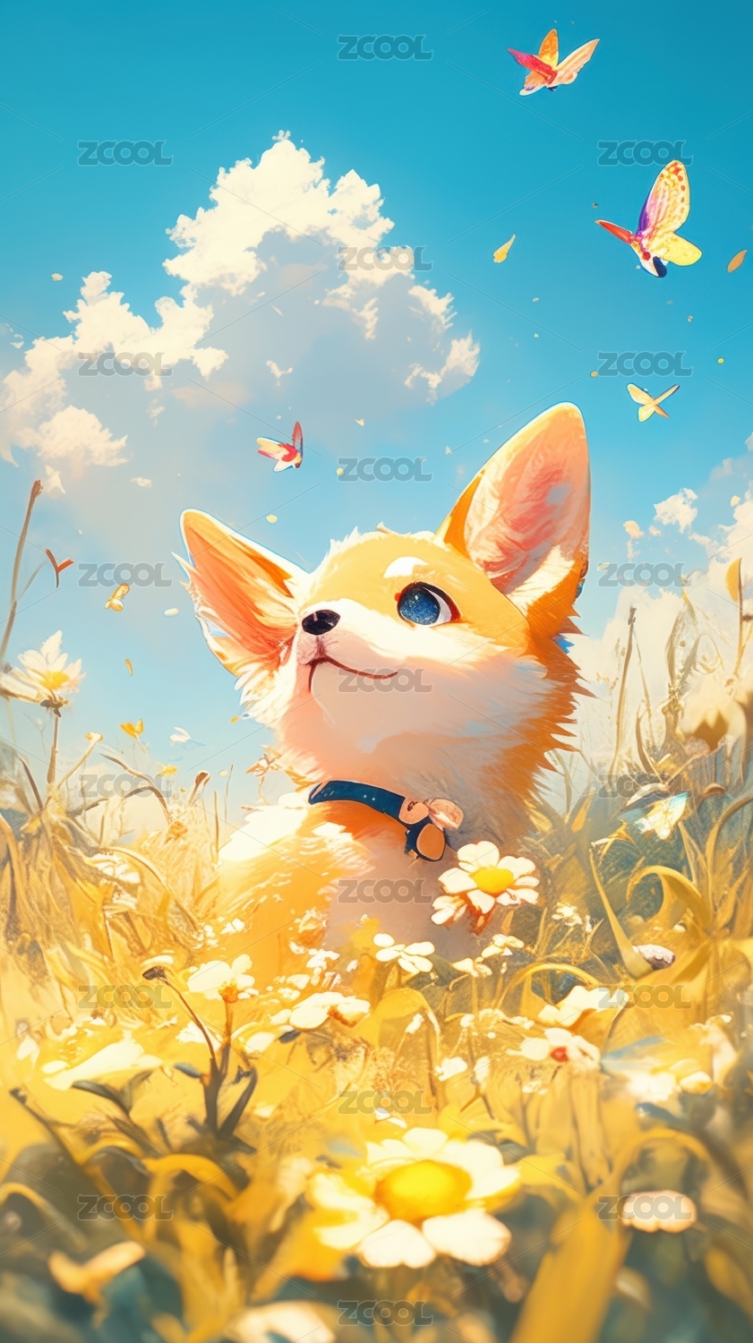 一只可爱的柴犬在白色花丛微笑奔跑手绘插画