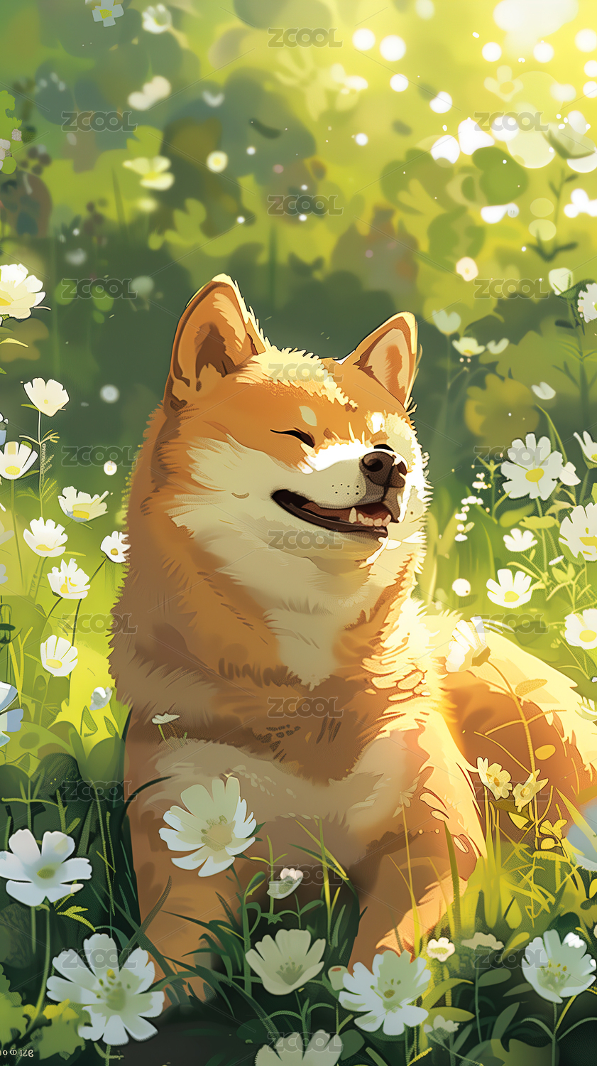 白色花丛里一只可爱的柴犬在微笑手绘插画